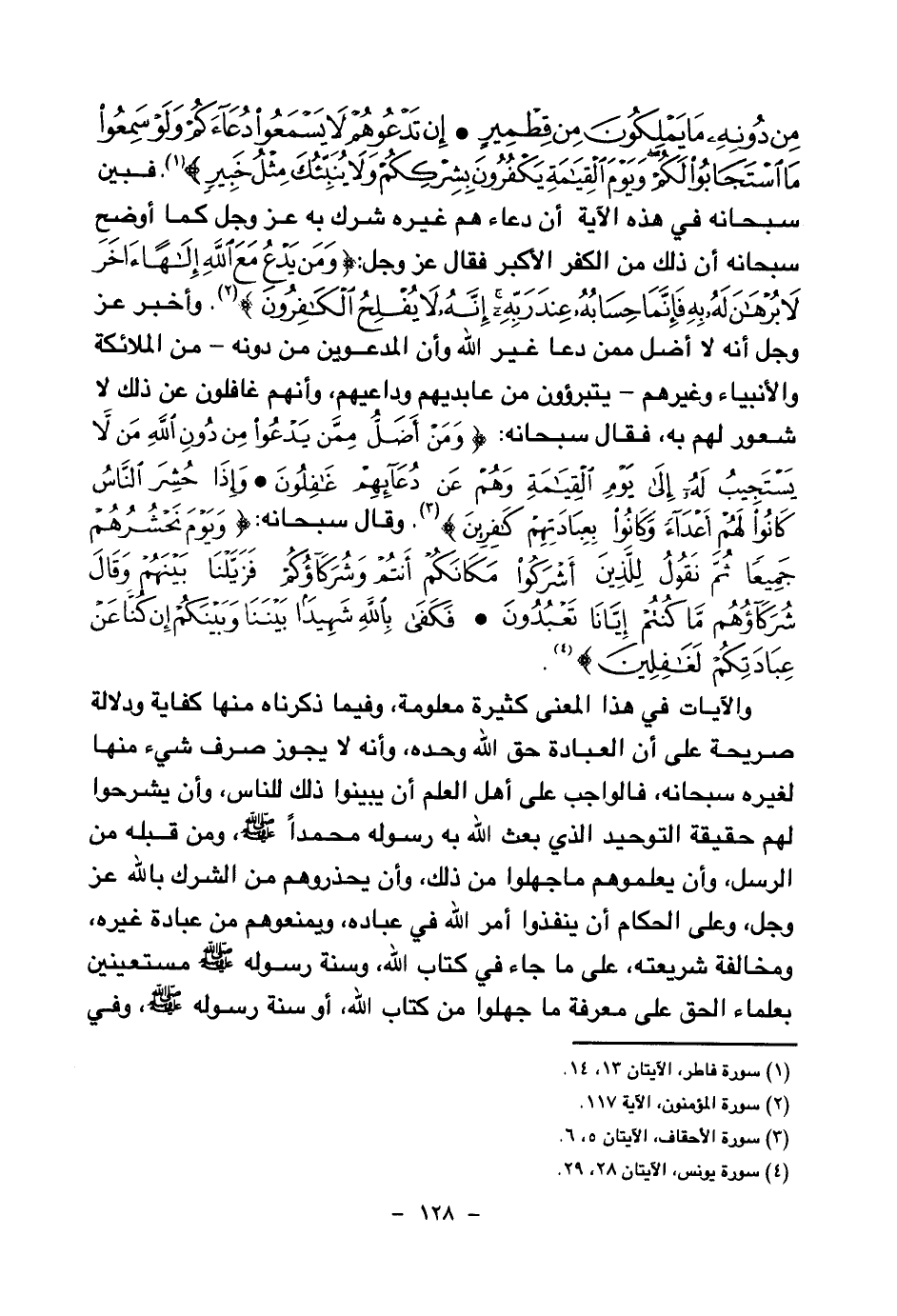 والآيات في هذا المعنى كثيرة معلومة، وفيما ذكرناه منها كفاية ودلالة صريحة على أن العبادة حق الله وحده، وأنه لا يجوز صرف شيء منها لغيره سبحانه، فالواجب على أهل العلم أن يبينوا ذلك للناس، وأن يشرحوا لهم حقيقة التوحيد الذي بعث الله به رسوله محمدا صلى الله عليه وسلم، ومن قبله من الرسل، وأن يعلموهم ما جهلوا من ذلك، وأن يحذروهم من الشرك بالله عز وجل، وعلى الحكام أن ينفذوا أمر الله في عباده، ويمنعوهم من عبادة غيره، ومخالفة شريعته، على ما جاء في كتاب الله، وسنة رسوله صلى الله عليه وسلم مستعينين بعلماء الحق على معرفة ما جهلوا من كتاب الله، أو سنة رسوله صلى الله عليه وسلم، وفي
