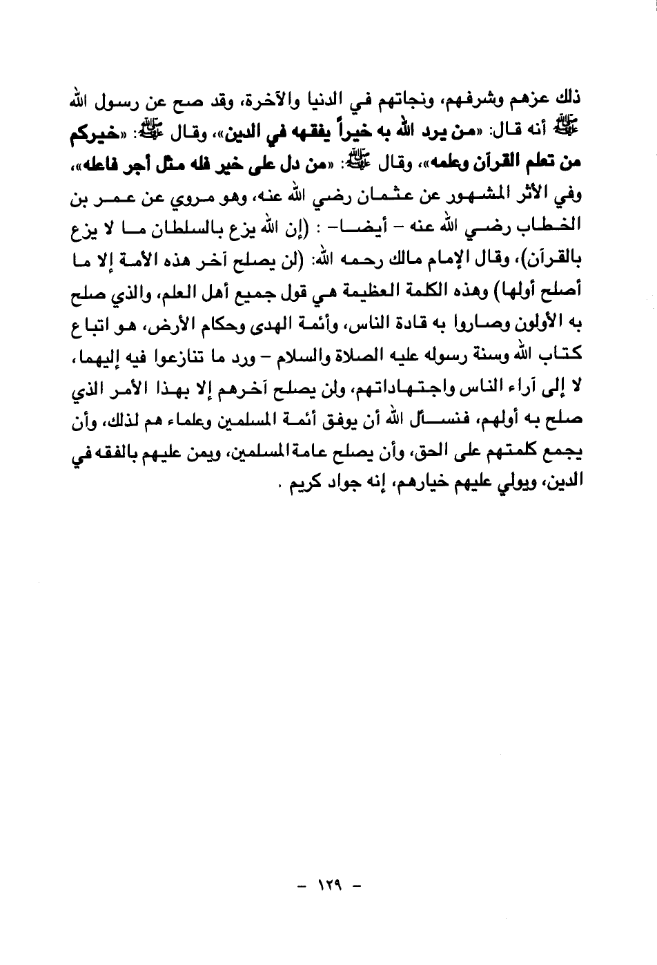 ذلك عزهم وشرفهم، ونجاتهم في الدنيا والآخرة، وقد صح عن رسول الله صلى الله عليه وسلم أنه قال: «من يرد الله به خيرا يفقهه في الدين (¬1) » وقال صلى الله عليه وسلم: «خيركم من تعلم القرآن وعلمه (¬2) » وقال صلى الله عليه وسلم: «من دل على خير فله مثل أجر فاعله (¬3) » وفي الأثر المشهور عن عثمان رضي الله عنه وهو مروي عن عمر بن الخطاب رضي الله عنه - أيضا - إن الله يزع بالسلطان ما لا يزع بالقرآن. وقال الإمام مالك رحمه الله: (لن يصلح آخر هذه الأمة إلا ما أصلح أولها) وهذه الكلمة العظيمة هي قول جميع أهل العلم، والذي صلح به الأولون وصاروا به قادة الناس، وأئمة الهدى وحكام الأرض، هو اتباع كتاب الله وسنة رسوله عليه الصلاة والسلام - ورد ما تنازعوا فيه إليهما، لا إلى آراء الناس واجتهاداتهم، ولن يصلح آخرهم إلا بهذا الأمر الذي صلح به أولهم، فنسأل الله أن يوفق أئمة المسلمين وعلماءهم لذلك، وأن يجمع كلمتهم على الحق، وأن يصلح عامة المسلمين، ويمن عليهم بالفقه في الدين، ويولي عليهم خيارهم، إنه جواد كريم.