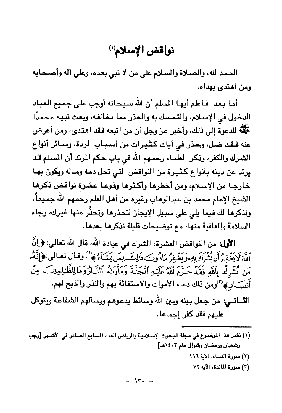 أما بعد: فاعلم أيها المسلم أن الله سبحانه أوجب على جميع العباد الدخول في الإسلام، والتمسك به والحذر مما يخالفه، وبعث نبيه محمدا صلى الله عليه وسلم للدعوة إلى ذلك، وأخبر عز وجل أن من اتبعه فقد اهتدى، ومن أعرض عنه فقد ضل، وحذر في آيات كثيرات من أسباب الردة، وسائر أنواع الشرك والكفر، وذكر العلماء رحمهم الله في باب حكم المرتد أن المسلم قد يرتد عن دينه بأنواع كثيرة من النواقض التي تحل دمه وماله ويكون بها خارجا من الإسلام، ومن أخطرها وأكثرها وقوعا عشرة نواقض ذكرها الشيخ الإمام محمد بن عبد الوهاب وغيره من أهل العلم رحمهم الله جميعا، ونذكرها لك فيما يلي على سبيل الإيجاز لتحذرها وتحذر منها غيرك، رجاء السلامة والعافية منها، مع توضيحات قليلة نذكرها بعدها.