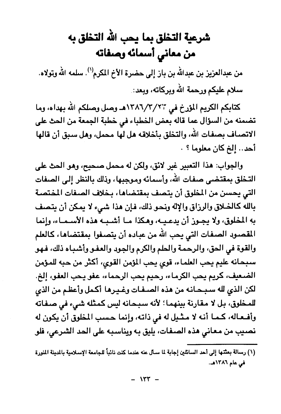 كتابكم الكريم المؤرخ في 23 \ 3 \ 1386هـ وصل وصلكم الله بهداه، وما تضمنه من السؤال عما قاله بعض الخطباء في خطبة الجمعة من الحث على الاتصاف بصفات الله، والتخلق بأخلاقه هل لها محمل، وهل سبق أن قالها أحد.. إلخ كان معلوما؟