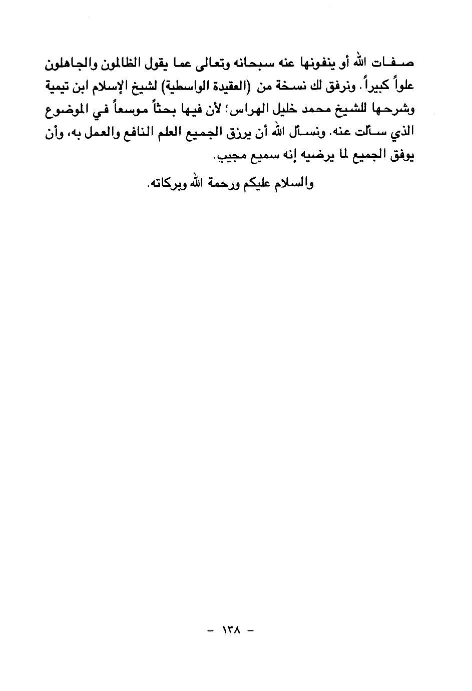 صفات الله أو ينفونها عنه سبحانه وتعالى عما يقول الظالمون والجاهلون علوا كبيرا. ونرفق لك نسخة من (العقيدة الواسطية) لشيخ الإسلام ابن تيمية وشرحها للشيخ محمد خليل الهراس؛ لأن فيها بحثا موسعا في الموضوع الذي سألت عنه. ونسأل الله أن يرزق الجميع العلم النافع والعمل به، وأن يوفق الجميع لما يرضيه إنه سميع مجيب.