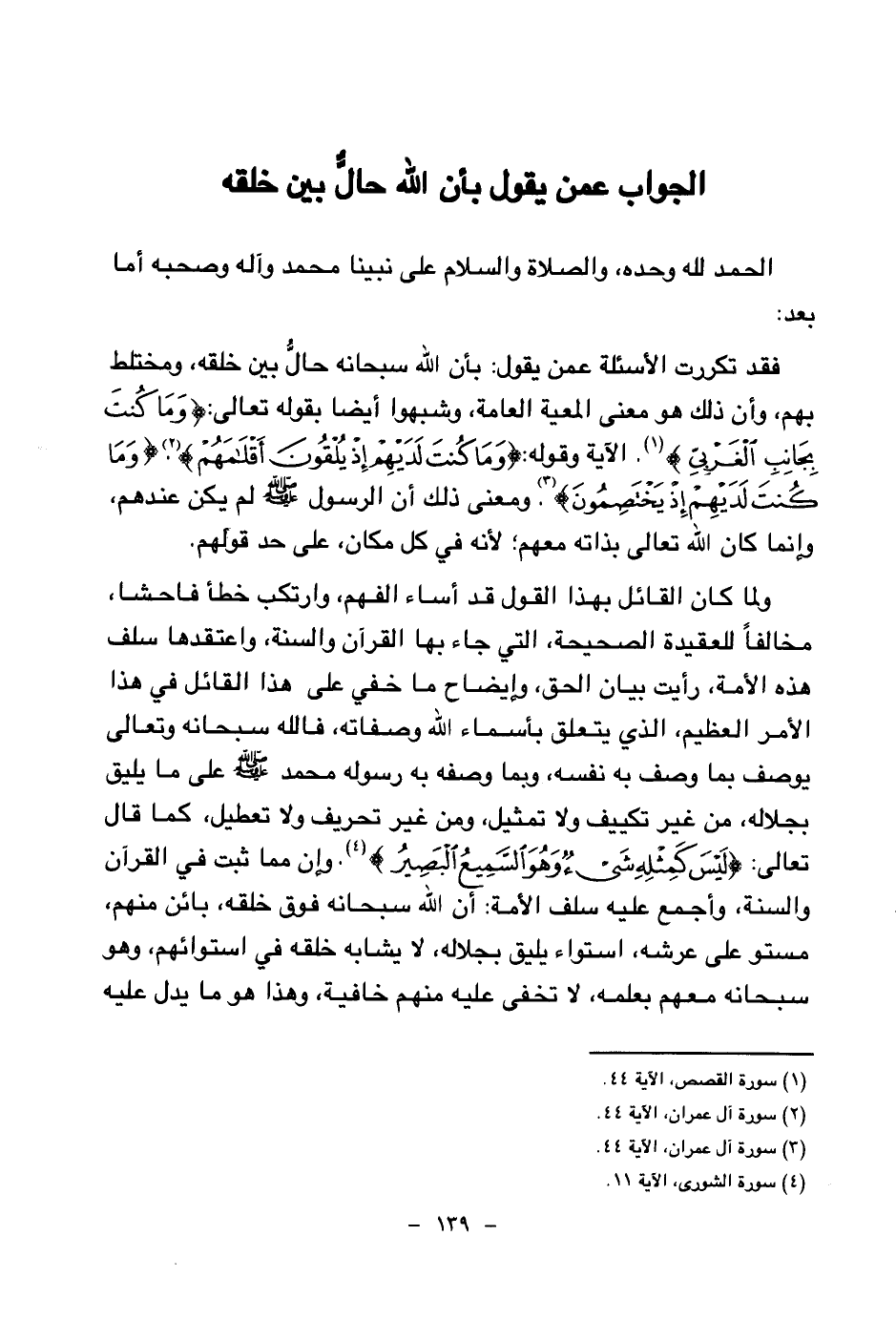 ولما كان القائل بهذا القول قد أساء الفهم، وارتكب خطأ فاحشا، مخالفا للعقيدة الصحيحة، التي جاء بها القرآن والسنة، واعتقدها سلف هذه الأمة، رأيت بيان الحق، وإيضاح ما خفي على هذا القائل في هذا الأمر العظيم، الذي يتعلق بأسماء الله وصفاته، فالله سبحانه وتعالى يوصف بما وصف به نفسه، وبما وصفه به رسوله محمد صلى الله عليه وسلم على ما يليق بجلاله، من غير تكييف ولا تمثيل، ومن غير تحريف ولا تعطيل، كما قال تعالى: {لَيْسَ كَمِثْلِهِ شَيْءٌ وَهُوَ السَّمِيعُ الْبَصِيرُ} (¬3) وإن مما ثبت في القرآن والسنة، وأجمع عليه سلف الأمة: أن الله سبحانه فوق خلقه، بائن منهم، مستو على عرشه، استواء يليق بجلاله، لا يشابه خلقه في استوائهم، وهو سبحانه معهم بعلمه، لا تخفى عليه منهم خافية، وهذا هو ما يدل عليه