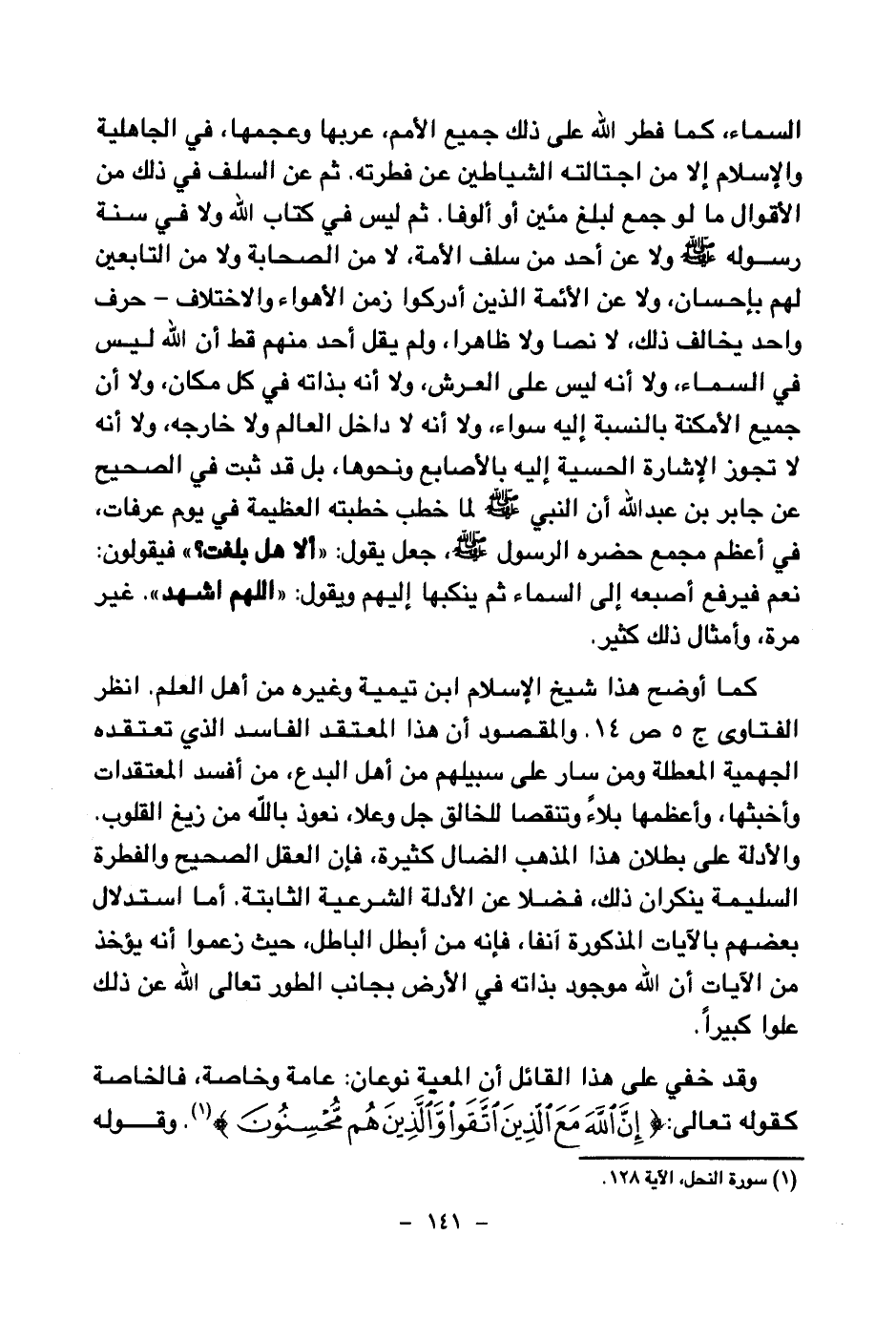 السماء، كما فطر الله على ذلك جميع الأمم، عربها وعجمها، في الجاهلية والإسلام إلا من اجتالته الشياطين عن فطرته، ثم عن السلف في ذلك من الأقوال ما لو جمع لبلغ مئين أو ألوفا، ثم ليس في كتاب الله ولا في سنة رسوله صلى الله عليه وسلم ولا عن أحد من سلف الأمة، لا من الصحابة ولا من التابعين لهم بإحسان، ولا عن الأئمة الذين أدركوا زمن الأهواء والاختلاف - حرف واحد يخالف ذلك، لا نصا ولا ظاهرا، ولم يقل أحد منهم قط أن الله ليس في السماء، ولا أنه ليس على العرش، ولا أنه بذاته في كل مكان، ولا أن جميع الأمكنة بالنسبة إليه سواء، ولا أنه لا داخل العالم ولا خارجه، ولا أنه لا تجوز الإشارة الحسية إليه بالأصابع ونحوها، بل قد ثبت في الصحيح عن جابر بن عبد الله أن النبي صلى الله عليه وسلم لما خطب خطبته العظيمة في يوم عرفات، في أعظم مجمع حضره الرسول صلى الله عليه وسلم جعل يقول: «ألا هل بلغت؟ فيقولون نعم فيرفع أصبعه إلى السماء ثم ينكبها إليهم ويقول اللهم اشهد» . غير مرة، وأمثال ذلك كثير.