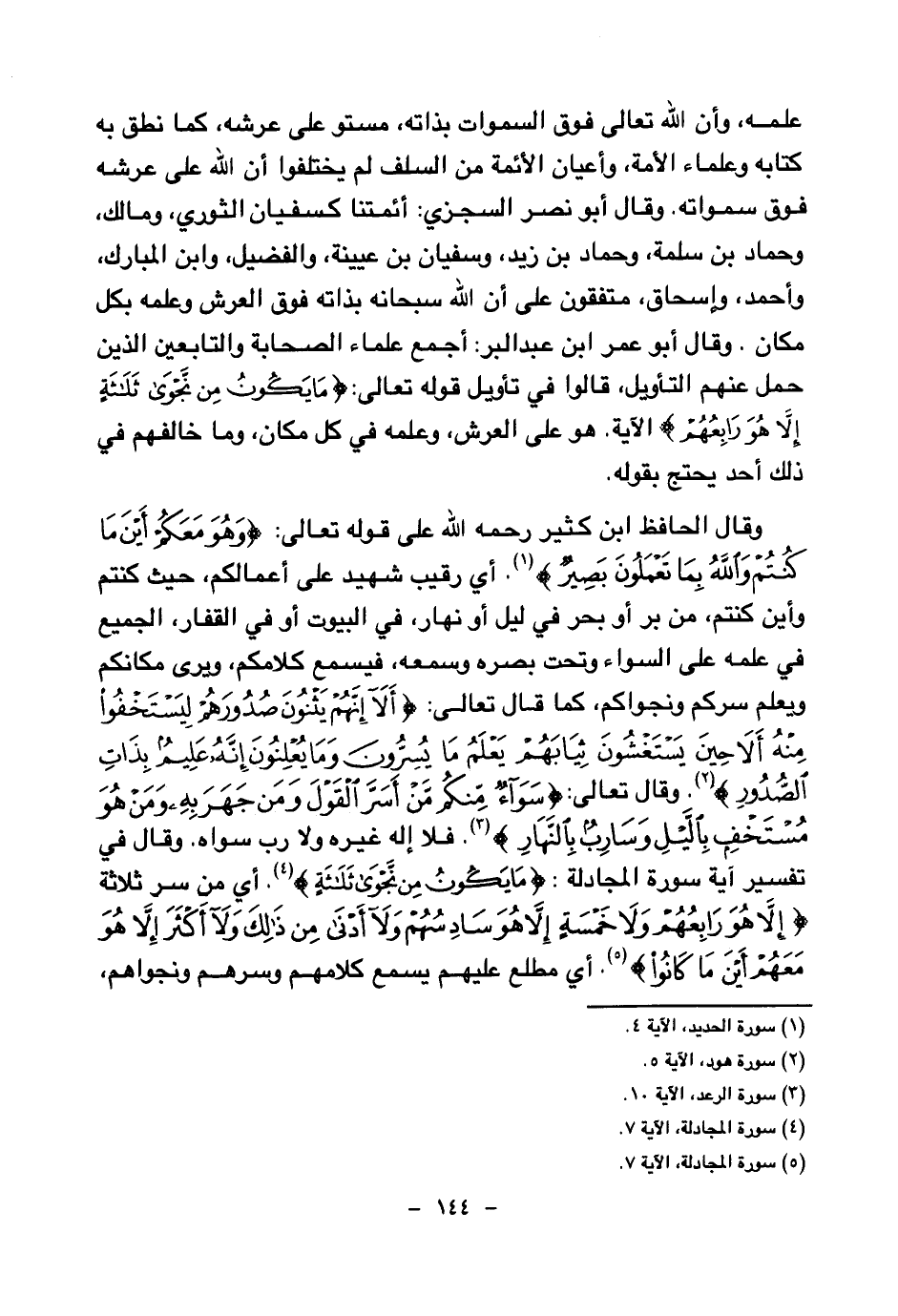 علمه، وأن الله تعالى فوق السماوات بذاته، مستو على عرشه، كما نطق به كتابه وعلماء الأمة، وأعيان الأئمة من السلف لم يختلفوا أن الله على عرشه فوق سماواته، وقال أبو نصر السجزي: أئمتنا كسفيان الثوري، ومالك، وحماد بن سلمة، وحماد بن زيد، وسفيان بن عيينة، والفضيل، وابن المبارك، وأحمد، وإسحاق، متفقون على أن الله سبحانه بذاته فوق العرش وعلمه بكل مكان. وقال أبو عمر ابن عبد البر: أجمع علماء الصحابة والتابعين الذين حمل عنهم التأويل، قالوا في تأويل قوله تعالى: {مَا يَكُونُ مِنْ نَجْوَى ثَلَاثَةٍ إِلَّا هُوَ رَابِعُهُمْ} (¬1) الآية وهو على العرش، وعلمه في كل مكان، وما خالفهم في ذلك أحد يحتج بقوله. وقال الحافظ ابن كثير رحمه الله على قوله تعالى: {وَهُوَ مَعَكُمْ أَيْنَ مَا كُنْتُمْ وَاللَّهُ بِمَا تَعْمَلُونَ بَصِيرٌ} (¬2) أي رقيب شهيد على أعمالكم، حيث كنتم وأين كنتم، من بر أو بحر في ليل أو نهار، في البيوت أو في القفار، الجميع في علمه على السواء وتحت بصره وسمعه، فيسمع كلامكم، ويرى مكانكم ويعلم سركم ونجواكم، كما قال تعالى: {أَلَا إِنَّهُمْ يَثْنُونَ صُدُورَهُمْ لِيَسْتَخْفُوا مِنْهُ أَلَا حِينَ يَسْتَغْشُونَ ثِيَابَهُمْ يَعْلَمُ مَا يُسِرُّونَ وَمَا يُعْلِنُونَ إِنَّهُ عَلِيمٌ بِذَاتِ الصُّدُورِ} (¬3) وقال تعالى: {سَوَاءٌ مِنْكُمْ مَنْ أَسَرَّ الْقَوْلَ وَمَنْ جَهَرَ بِهِ وَمَنْ هُوَ مُسْتَخْفٍ بِاللَّيْلِ وَسَارِبٌ بِالنَّهَارِ} (¬4) فلا إله غيره ولا رب سواه. وقال في تفسير آية سورة المجادلة: {مَا يَكُونُ مِنْ نَجْوَى ثَلَاثَةٍ} (¬5) أي من سر ثلاثة {إِلَّا هُوَ رَابِعُهُمْ وَلَا خَمْسَةٍ إِلَّا هُوَ سَادِسُهُمْ وَلَا أَدْنَى مِنْ ذَلِكَ وَلَا أَكْثَرَ إِلَّا هُوَ مَعَهُمْ أَيْنَ مَا كَانُوا} (¬6) أي مطلع عليهم يسمع كلامهم وسرهم ونجواهم،