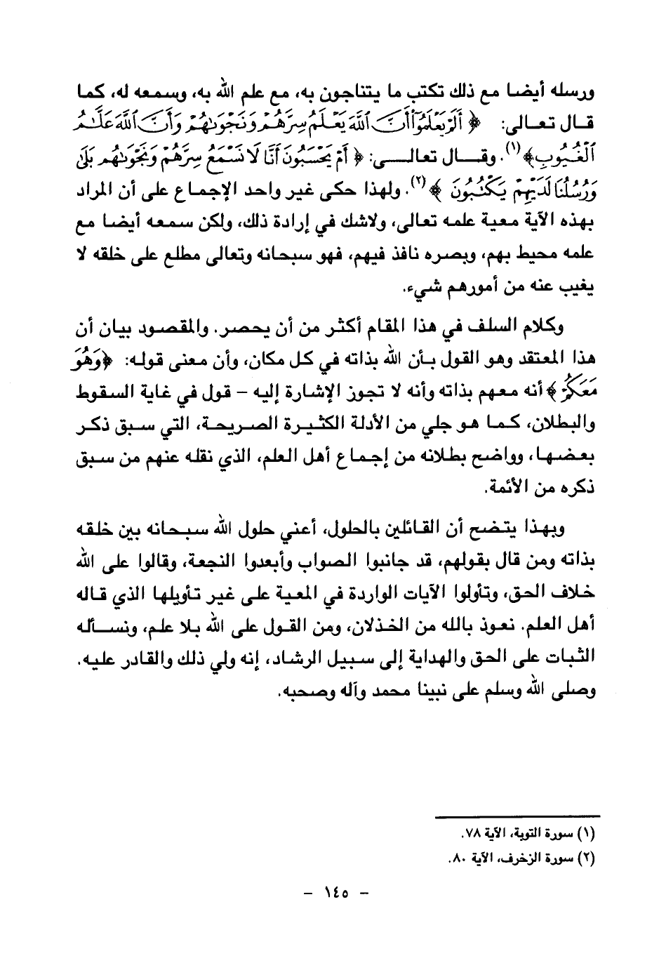 وبهذا يتضح أن القائلين بالحلول، أعني حلول الله سبحانه بين خلقه بذاته ومن قال بقولهم، قد جانبوا الصواب وأبعدوا النجعة، وقالوا على الله خلاف الحق، وتأولوا الآيات الواردة في المعية على غير تأويلها الذي قاله أهل العلم. نعوذ بالله من الخذلان، ومن القول على الله بلا علم، ونسأله الثبات على الحق والهداية إلى سبيل الرشاد، إنه ولي ذلك والقادر عليه وصلى الله وسلم على نبينا محمد وآله وصحبه.