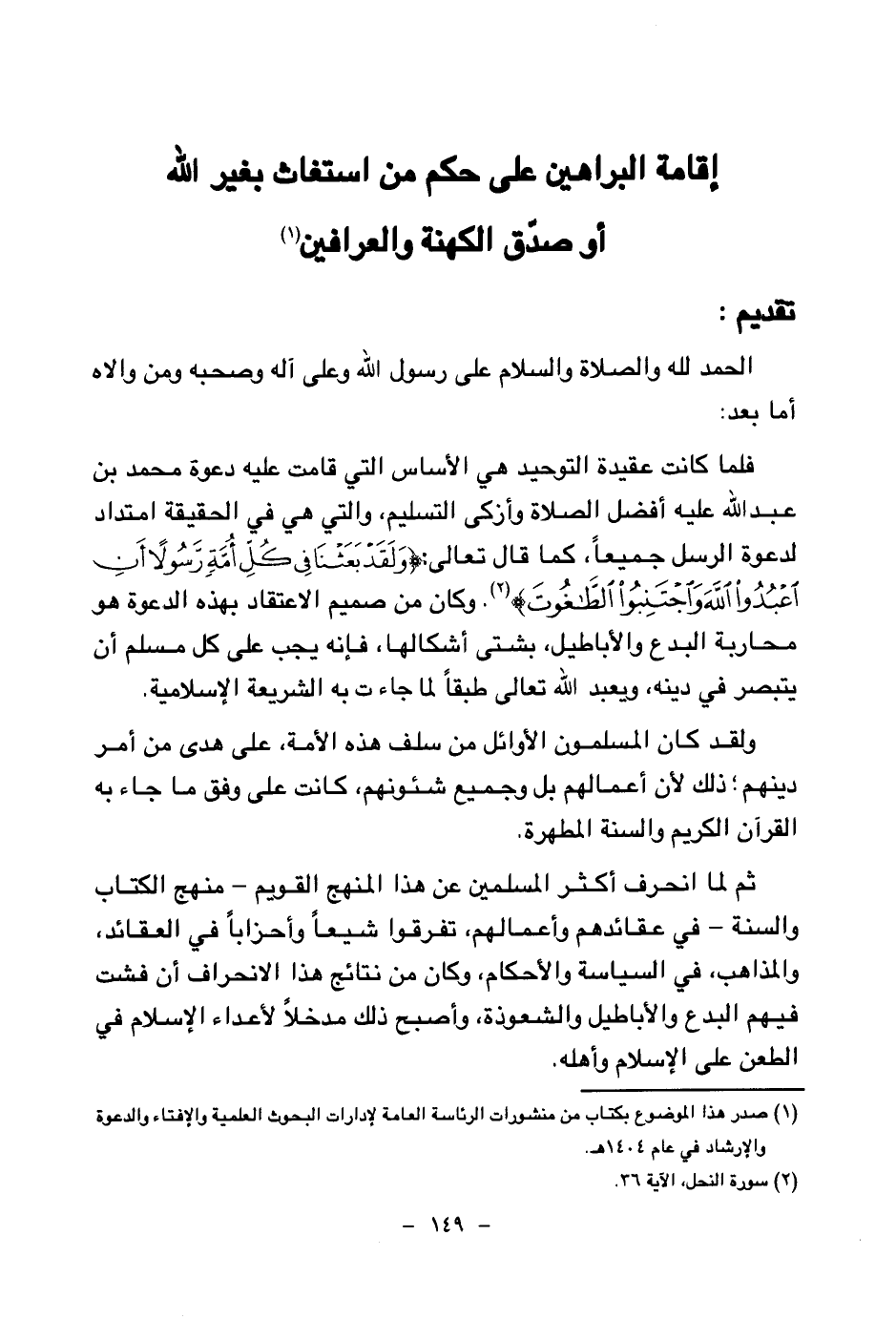 الحمد لله والصلاة والسلام على رسول الله وعلى آله وصحبه ومن والاه أما بعد: فلما كانت عقيدة التوحيد هي الأساس التي قامت عليه دعوة محمد بن عبد الله عليه أفضل الصلاة وأزكى التسليم، والتي هي في الحقيقة امتداد لدعوة الرسل جميعا، كما قال تعالى {وَلَقَدْ بَعَثْنَا فِي كُلِّ أُمَّةٍ رَسُولًا أَنِ اُعْبُدُوا اللَّهَ وَاجْتَنِبُوا الطَّاغُوتَ} (¬1) وكان من صميم الاعتقاد بهذه الدعوة هو محاربة البدع والأباطيل، بشتى أشكالها، فإنه يجب على كل مسلم أن يتبصر في دينه، ويعبد الله تعالى طبقا لما جاءت به الشريعة الإسلامية.