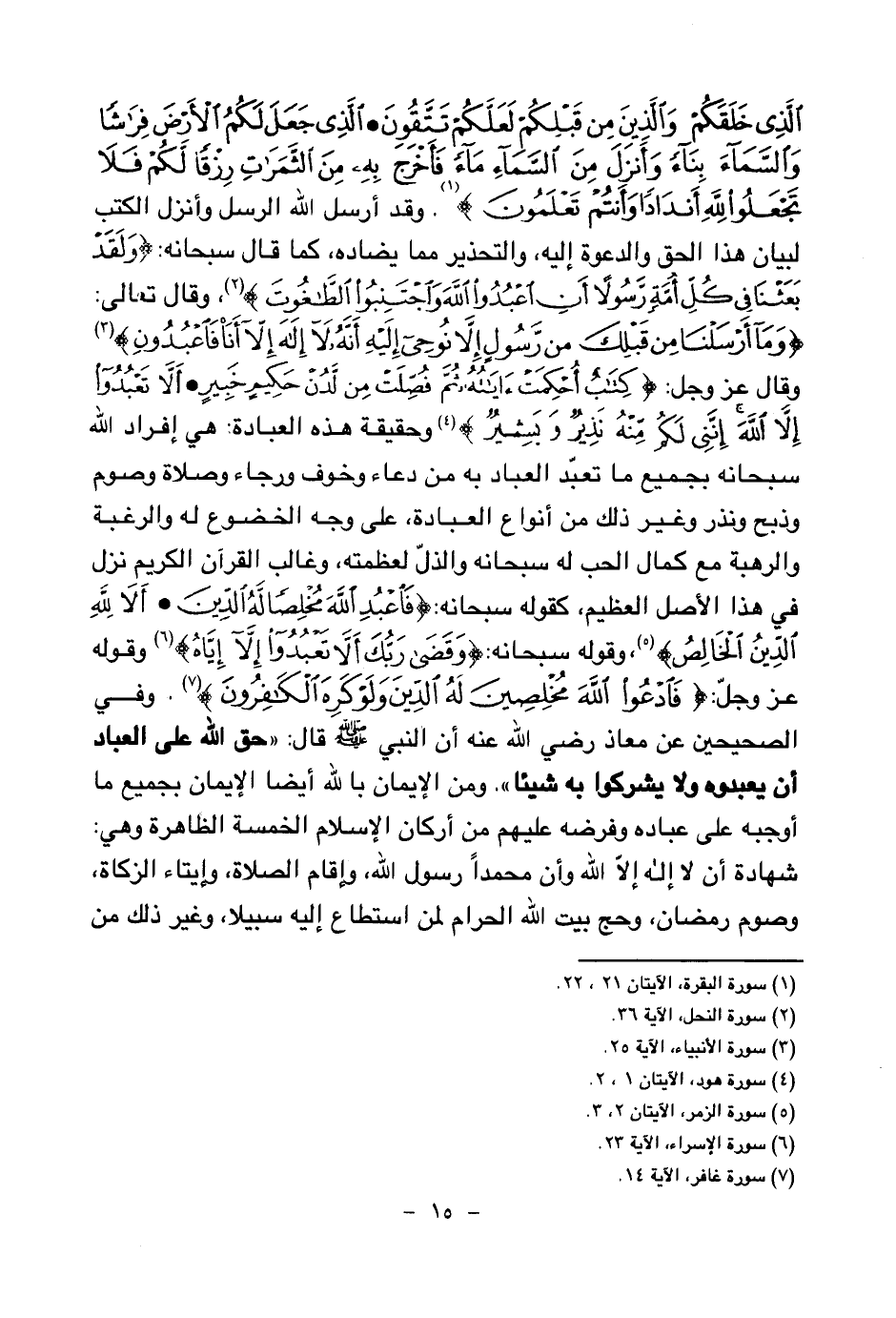 وقد أرسل الله الرسل وأنزل الكتب لبيان هذا الحق والدعوة إليه, والتحذير مما يضاده, كما قال سبحانه: {وَلَقَدْ بَعَثْنَا فِي كُلِّ أُمَّةٍ رَسُولًا أَنِ اُعْبُدُوا اللَّهَ وَاجْتَنِبُوا الطَّاغُوتَ} (¬1) وقال تعالى: {وَمَا أَرْسَلْنَا مِنْ قَبْلِكَ مِنْ رَسُولٍ إِلَّا نُوحِي إِلَيْهِ أَنَّهُ لَا إِلَهَ إِلَّا أَنَا فَاعْبُدُونِ} (¬2) وقال عز وجل: {كِتَابٌ أُحْكِمَتْ آيَاتُهُ ثُمَّ فُصِّلَتْ مِنْ لَدُنْ حَكِيمٍ خَبِيرٍ} (¬3) {أَلَّا تَعْبُدُوا إِلَّا اللَّهَ إِنَّنِي لَكُمْ مِنْهُ نَذِيرٌ وَبَشِيرٌ} (¬4) وحقيقة هذه العبادة: هي إفراد الله سبحانه بجميع ما تعبد العباد به من دعاء وخوف ورجاء وصلاة وصوم وذبح ونذر وغير ذلك من أنواع العبادة, على وجه الخضوع له والرغبة والرهبة مع كمال الحب له سبحانه والذل لعظمته, وغالب القرآن الكريم نزل في هذا الأصل العظيم, كقوله سبحانه: {فَاعْبُدِ اللَّهَ مُخْلِصًا لَهُ الدِّينَ} (¬5) {أَلَا لِلَّهِ الدِّينُ الْخَالِصُ} (¬6) وقوله سبحانه: {وَقَضَى رَبُّكَ أَلَّا تَعْبُدُوا إِلَّا إِيَّاهُ} (¬7) وقوله عز وجل: {فَادْعُوا اللَّهَ مُخْلِصِينَ لَهُ الدِّينَ وَلَوْ كَرِهَ الْكَافِرُونَ} (¬8) وفي الصحيحين عن معاذ رضي الله عنه أن النبي صلى الله عليه وسلم قال: «حق الله على العباد أن يعبدوه ولا يشركوا به شيئا (¬9) » .