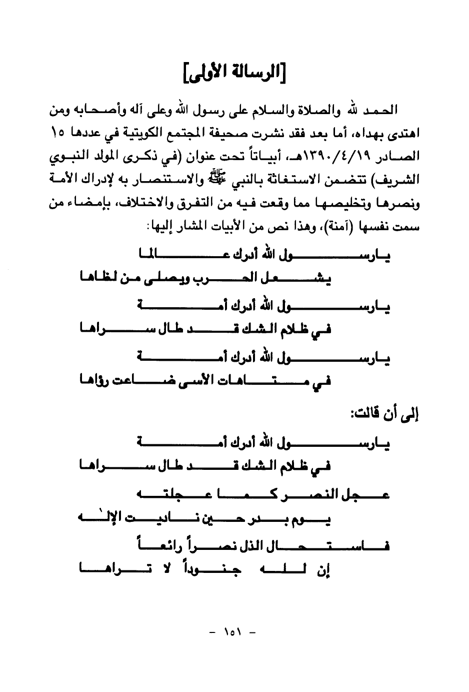 الحمد لله والصلاة والسلام على رسول الله وعلى آله وأصحابه ومن اهتدى بهداه، أما بعد فقد نشرت صحيفة المجتمع الكويتية في عددها 15 الصادر 19 \ 4 \ 1390 هـ أبياتا تحت عنوان (في ذكرى المولد النبوي الشريف) تتضمن الاستغاثة بالنبي صلى الله عليه وسلم والاستنصار به لإدراك الأمة ونصرها وتخليصها مما وقعت فيه من التفرق والاختلاف، بإمضاء من سمت نفسها آمنة، وهذا نص من الأبيات المشار إليها: