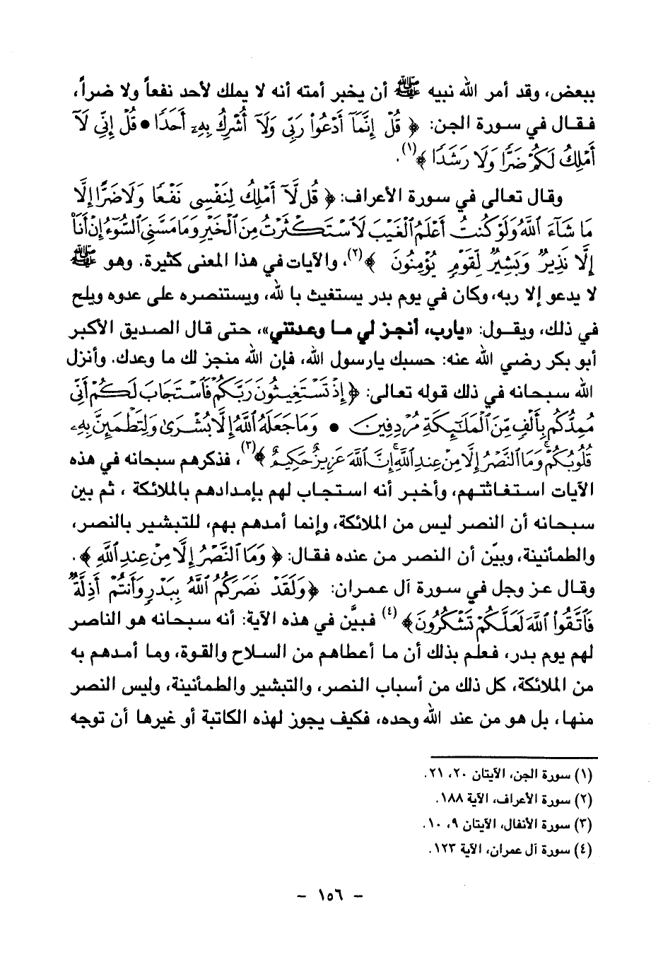 وبين أن النصر من عنده فقال: {وَمَا النَّصْرُ إِلَّا مِنْ عِنْدِ اللَّهِ} (¬7) وقال عز وجل في سورة آل عمران: {وَلَقَدْ نَصَرَكُمُ اللَّهُ بِبَدْرٍ وَأَنْتُمْ أَذِلَّةٌ فَاتَّقُوا اللَّهَ لَعَلَّكُمْ تَشْكُرُونَ} (¬8) فبين في هذه الآية: أنه سبحانه هو الناصر لهم يوم بدر، فعلم بذلك أن ما أعطاهم من السلاح والقوة، وما أمدهم به من الملائكة، كل ذلك من أسباب النصر، والتبشير والطمأنينة، وليس النصر منها، بل هو من عند الله وحده، فكيف يجوز لهذه الكاتبة أو غيرها أن توجه