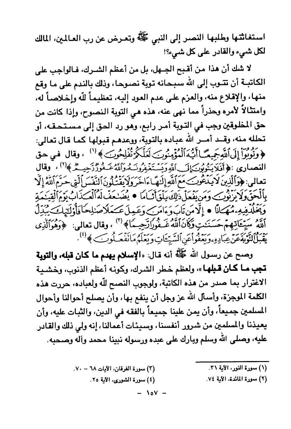 وصح عن رسول الله صلى الله عليه وسلم أنه قال: «الإسلام يهدم ما كان قبله والتوبة تجب ما كان قبلها (¬7) » ولعظم خطر الشرك، وكونه أعظم الذنوب، وخشية الاغترار بما صدر من هذه الكاتبة، ولوجوب النصح لله ولعباده، حررت هذه الكلمة الموجزة، وأسأل الله عز وجل أن ينفع بها، وأن يصلح أحوالنا وأحوال المسلمين جميعا، وأن يمن علينا جميعا بالفقه في الدين، والثبات عليه، وأن يعيذنا والمسلمين من شرور أنفسنا وسيئات أعمالنا إنه ولي ذلك والقادر عليه وصلى الله وسلم وبارك على عبده ورسوله نبينا محمد وآله وصحبه.