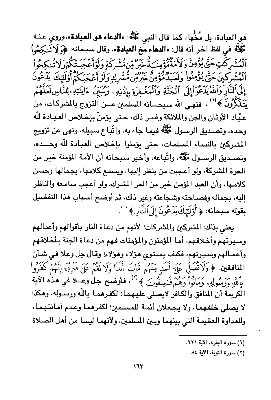 هو العبادة، بل مخها، كما قال النبي صلى الله عليه وسلم: «الدعاء هو العبادة (¬1) » وروي عنه صلى الله عليه وسلم في لفظ آخر أنه قال: «الدعاء مخ العبادة (¬2) » وقال سبحانه: {وَلَا تَنْكِحُوا الْمُشْرِكَاتِ حَتَّى يُؤْمِنَّ وَلَأَمَةٌ مُؤْمِنَةٌ خَيْرٌ مِنْ مُشْرِكَةٍ وَلَوْ أَعْجَبَتْكُمْ وَلَا تُنْكِحُوا الْمُشْرِكِينَ حَتَّى يُؤْمِنُوا وَلَعَبْدٌ مُؤْمِنٌ خَيْرٌ مِنْ مُشْرِكٍ وَلَوْ أَعْجَبَكُمْ أُولَئِكَ يَدْعُونَ إِلَى النَّارِ وَاللَّهُ يَدْعُو إِلَى الْجَنَّةِ وَالْمَغْفِرَةِ بِإِذْنِهِ وَيُبَيِّنُ آيَاتِهِ لِلنَّاسِ لَعَلَّهُمْ يَتَذَكَّرُونَ} (¬3) فنهى الله سبحانه المسلمين عن التزوج بالمشركات، من عباد الأوثان والجن والملائكة وغير ذلك، حتى يؤمن بإخلاص العبادة لله وحده، وتصديق الرسول صلى الله عليه وسلم فيما جاء به، واتباع سبيله، ونهى عن تزويج المشركين بالنساء المسلمات، حتى يؤمنوا بإخلاص العبادة لله وحده، وتصديق الرسول صلى الله عليه وسلم، واتباعه.