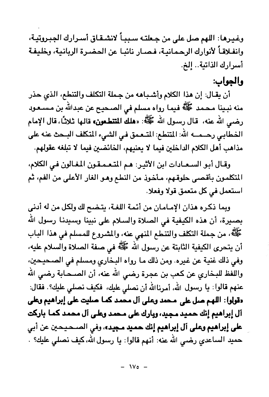 وبما ذكره هذان الإمامان من أئمة اللغة، يتضح لك ولكل من له أدنى بصيرة، أن هذه الكيفية في الصلاة والسلام على نبينا وسيدنا رسول الله صلى الله عليه وسلم، من جملة التكلف والتنطع المنهي عنه، والمشروع للمسلم في هذا الباب أن يتحرى الكيفية الثابتة عن رسول الله صلى الله عليه وسلم في صفة الصلاة والسلام عليه، وفي ذلك غنية عن غيره. ومن ذلك ما رواه البخاري ومسلم في الصحيحين، واللفظ للبخاري عن كعب بن عجرة رضي الله عنه، أن الصحابة رضي الله عنهم قالوا: «يا رسول الله أمرنا الله أن نصلي عليك، فكيف نصلي عليك؟ فقال: " قولوا اللهم صل على محمد وعلى آل محمد كما صليت على إبراهيم وعلى آل إبراهيم إنك حميد مجيد وبارك على محمد وعلى آل محمد كما باركت على إبراهيم وعلى آل إبراهيم إنك حميد مجيد (¬2) » وفي الصحيحين عن أبي حميد الساعدي رضي الله عنه: أنهم قالوا: «يا رسول الله كيف نصلي عليك؟
