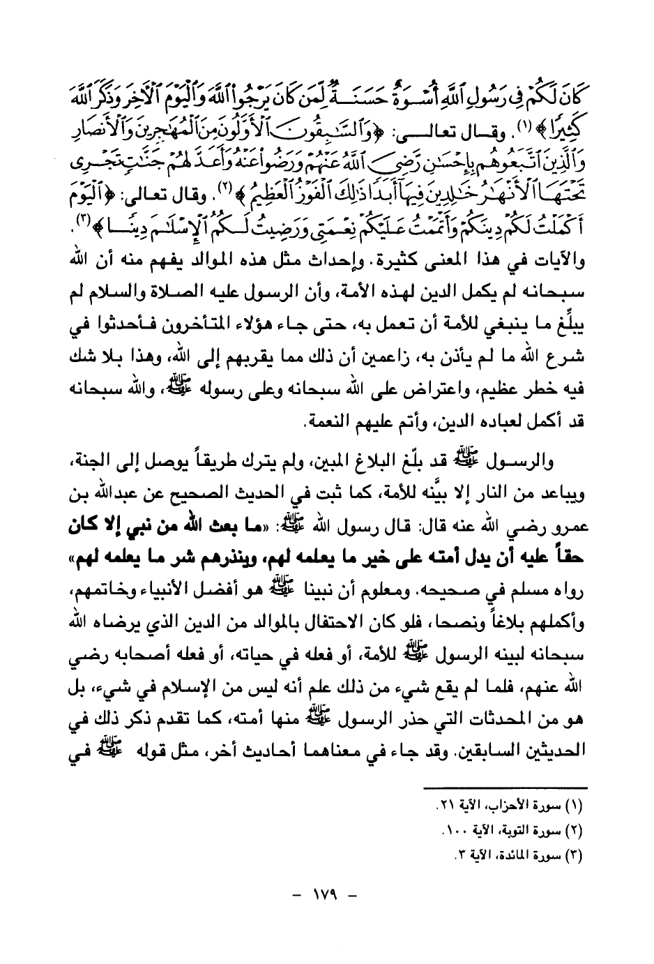 والآيات في هذا المعنى كثيرة. وإحداث مثل هذه الموالد يفهم منه أن الله سبحانه لم يكمل الدين لهذه الأمة، وأن الرسول عليه الصلاة والسلام لم يبلغ ما ينبغي للأمة أن تعمل به، حتى جاء هؤلاء المتأخرون فأحدثوا في شرع الله ما لم يأذن به، زاعمين أن ذلك مما يقربهم إلى الله، وهذا بلا شك فيه خطر عظيم، واعتراض على الله سبحانه وعلى رسوله صلى الله عليه وسلم، والله سبحانه قد أكمل لعباده الدين، وأتم عليهم النعمة.