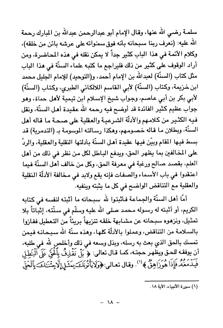 سلمة رضي الله عنها, وقال الإمام أبو عبد الرحمن عبد الله بن المبارك رحمة الله عليه: (نعرف ربنا سبحانه بأنه فوق سماواته على عرشه بائن من خلقه) , وكلام الأئمة في هذا الباب كثير جدا لا يمكن نقله في هذه المحاضرة, ومن أراد الوقوف على كثير من ذلك فليراجع ما كتبه علماء السنة في هذا الباب مثل كتاب (السنة) لعبد الله بن الإمام أحمد , و (التوحيد) للإمام الجليل محمد بن خزيمة , وكتاب (السنة) لأبي القاسم اللالكائي الطبري , وكتاب (السنة) لأبي بكر بن أبي عاصم , وجواب شيخ الإسلام ابن تيمية لأهل حماة , وهو جواب عظيم كثير الفائدة قد أوضح فيه رحمه الله عقيدة أهل السنة, ونقل فيه الكثير من كلامهم والأدلة الشرعية والعقلية على صحة ما قاله أهل السنة, وبطلان ما قاله خصومهم, وهكذا رسالته الموسومة بـ (التدمرية) قد بسط فيها المقام وبين فيها عقيدة أهل السنة بأدلتها النقلية والعقلية, والرد على المخالفين بما يظهر الحق, ويدفع الباطل لكل من نظر في ذلك من أهل العلم, بقصد صالح ورغبة في معرفة الحق, وكل من خالف أهل السنة فيما اعتقدوا في باب الأسماء والصفات فإنه يقع ولا بد في مخالفة الأدلة النقلية والعقلية مع التناقض الواضح في كل ما يثبته وينفيه.