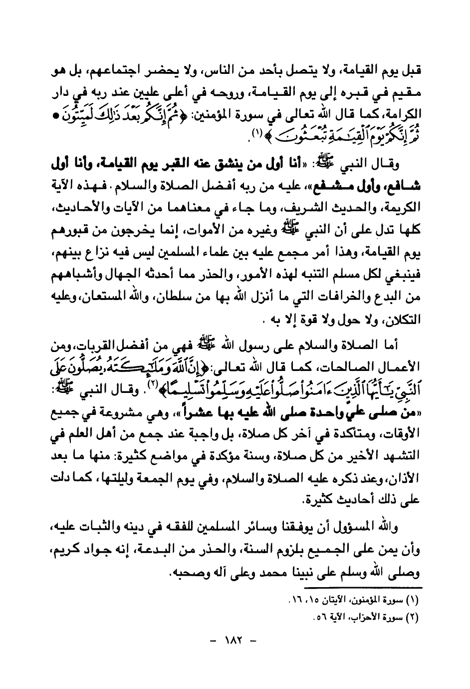 وقال النبي صلى الله عليه وسلم: «أنا أول من ينشق عنه القبر يوم القيامة وأنا أول شافع وأول مشفع (¬3) » ، عليه من ربه أفضل الصلاة والسلام، فهذه الآية الكريمة، والحديث الشريف، وما جاء في معناهما من الآيات والأحاديث، كلها تدل على أن النبي صلى الله عليه وسلم وغيره من الأموات، إنما يخرجون من قبورهم يوم القيامة، وهذا أمر مجمع عليه بين علماء المسلمين ليس فيه نزاع بينهم، فينبغي لكل مسلم التنبه لهذه الأمور، والحذر مما أحدثه الجهال وأشباههم من البدع والخرافات التي ما أنزل الله بها من سلطان، والله المستعان، وعليه التكلان، ولا حول ولا قوة إلا به.