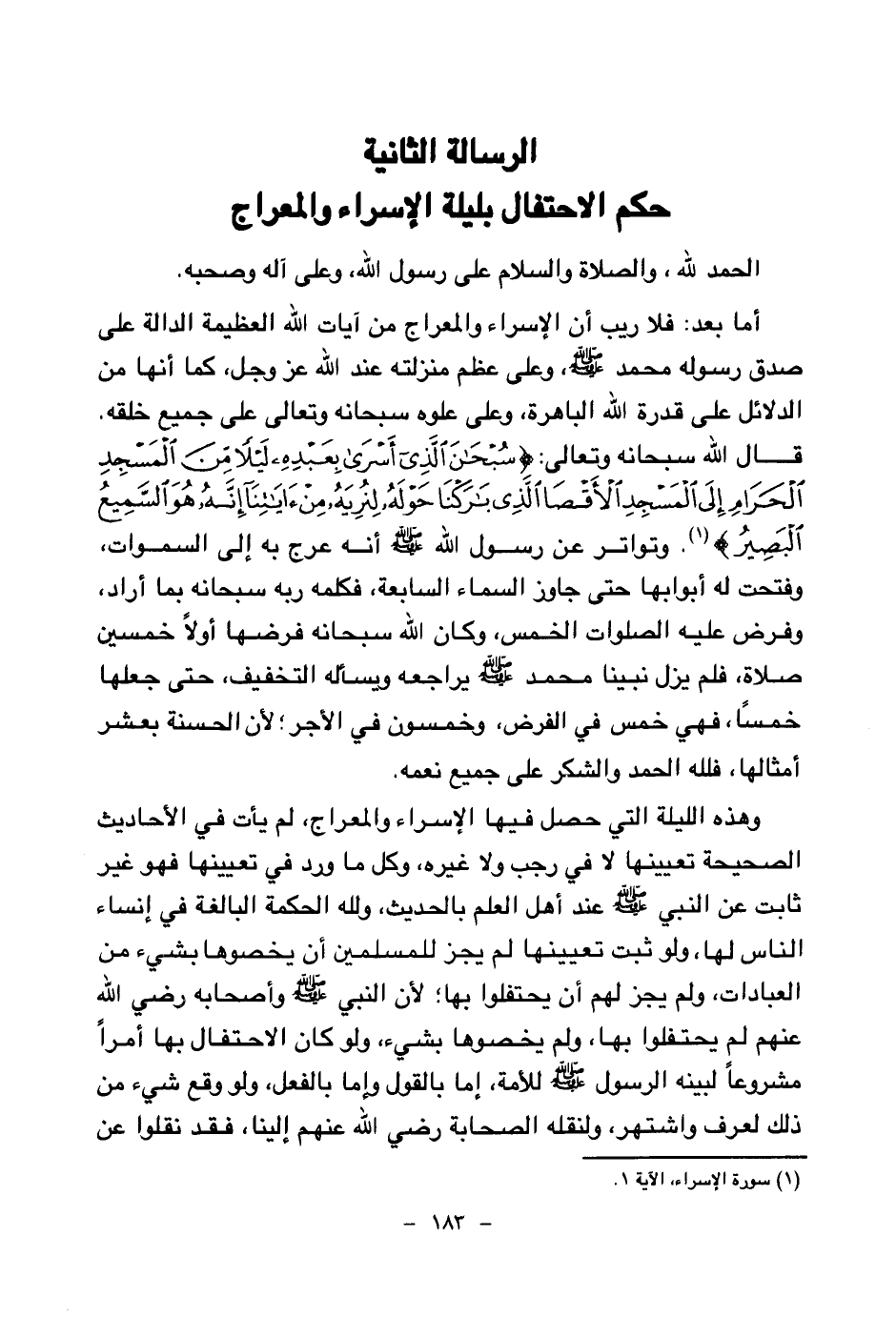 وهذه الليلة التي حصل فيها الإسراء والمعراج، لم يأت في الأحاديث الصحيحة تعيينها لا في رجب ولا غيره، وكل ما ورد في تعيينها فهو غير ثابت عن النبي صلى الله عليه وسلم عند أهل العلم بالحديث، ولله الحكمة البالغة في إنساء الناس لها، ولو ثبت تعيينها لم يجز للمسلمين أن يخصوها بشيء من العبادات، ولم يجز لهم أن يحتفلوا بها؛ لأن النبي صلى الله عليه وسلم وأصحابه رضي الله عنهم لم يحتفلوا بها، ولم يخصوها بشيء، ولو كان الاحتفال بها أمرا مشروعا لبينه الرسول صلى الله عليه وسلم للأمة، إما بالقول وإما بالفعل، ولو وقع شيء من ذلك لعرف واشتهر، ولنقله الصحابة رضي الله عنهم إلينا، فقد نقلوا عن