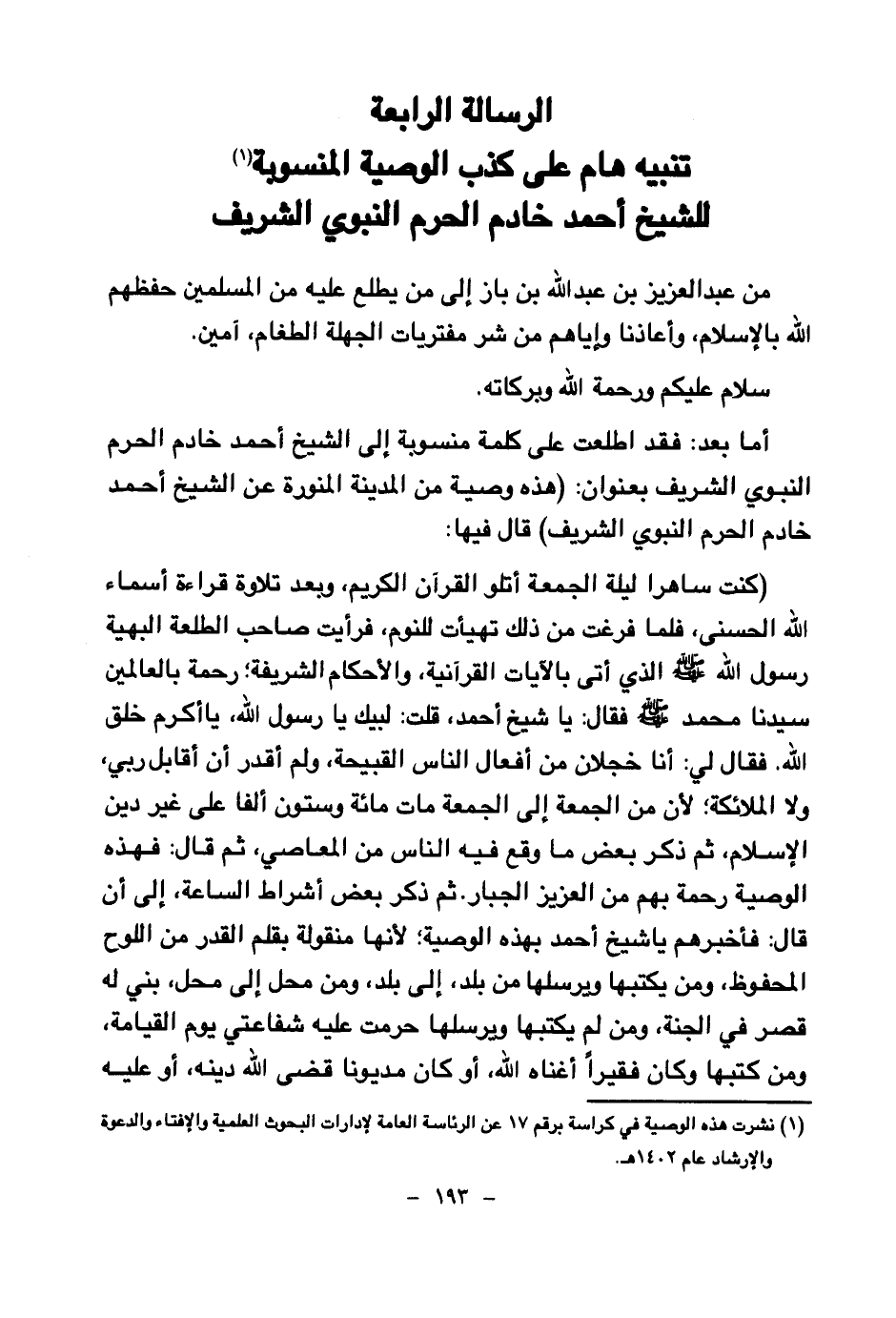 من عبد العزيز بن عبد الله بن باز إلى من يطلع عليه من المسلمين حفظهم الله بالإسلام، وأعاذنا وإياهم من شر مفتريات الجهلة الطغام، آمين.