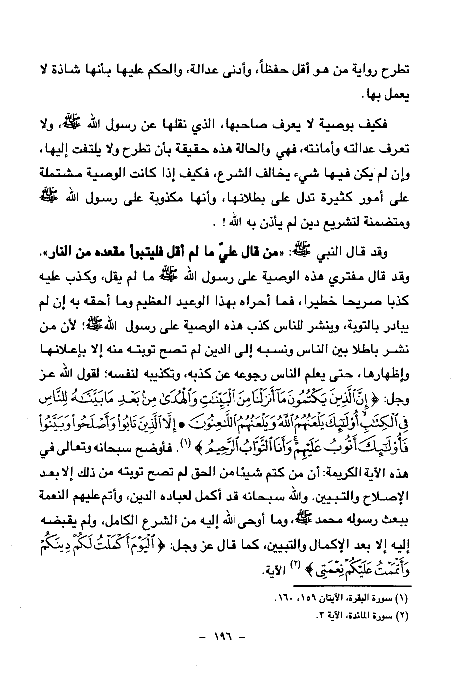 وقد قال النبي صلى الله عليه وسلم: «من قال علي ما لم أقل فليتبوأ مقعدة من النار (¬1) » وقد قال مفتري هذه الوصية على رسول الله صلى الله عليه وسلم ما لم يقل، وكذب عليه كذبا صريحا خطيرا، فما أحراه بهذا الوعيد العظيم وما أحقه به إن لم يبادر بالتوبة، وينشر للناس كذب هذه الوصية على رسول الله صلى الله عليه وسلم لأن من نشر باطلا بين الناس ونسبه إلى الدين لم تصح توبته منه إلا بإعلانها وإظهارها، حتى يعلم الناس رجوعه عن كذبه، وتكذيبه لنفسه؛ لقول الله عز وجل: {إِنَّ الَّذِينَ يَكْتُمُونَ مَا أَنْزَلْنَا مِنَ الْبَيِّنَاتِ وَالْهُدَى مِنْ بَعْدِ مَا بَيَّنَّاهُ لِلنَّاسِ فِي الْكِتَابِ أُولَئِكَ يَلْعَنُهُمُ اللَّهُ وَيَلْعَنُهُمُ اللَّاعِنُونَ} (¬2) {إِلَّا الَّذِينَ تَابُوا وَأَصْلَحُوا وَبَيَّنُوا فَأُولَئِكَ أَتُوبُ عَلَيْهِمْ وَأَنَا التَّوَّابُ الرَّحِيمُ} (¬3) فأوضح سبحانه وتعالى في هذه الآية الكريمة: أن من كتم شيئا من الحق لم تصح توبته من ذلك إلا بعد الإصلاح والتبيين، والله سبحانه قد أكمل لعباده الدين، وأتم عليهم النعمة ببعث رسوله محمد صلى الله عليه وسلم، وما أوحى الله إليه من الشرع الكامل، ولم يقبضه إليه إلا بعد الإكمال والتبيين، كما قال عز وجل: {الْيَوْمَ أَكْمَلْتُ لَكُمْ دِينَكُمْ وَأَتْمَمْتُ عَلَيْكُمْ نِعْمَتِي} (¬4) الآية