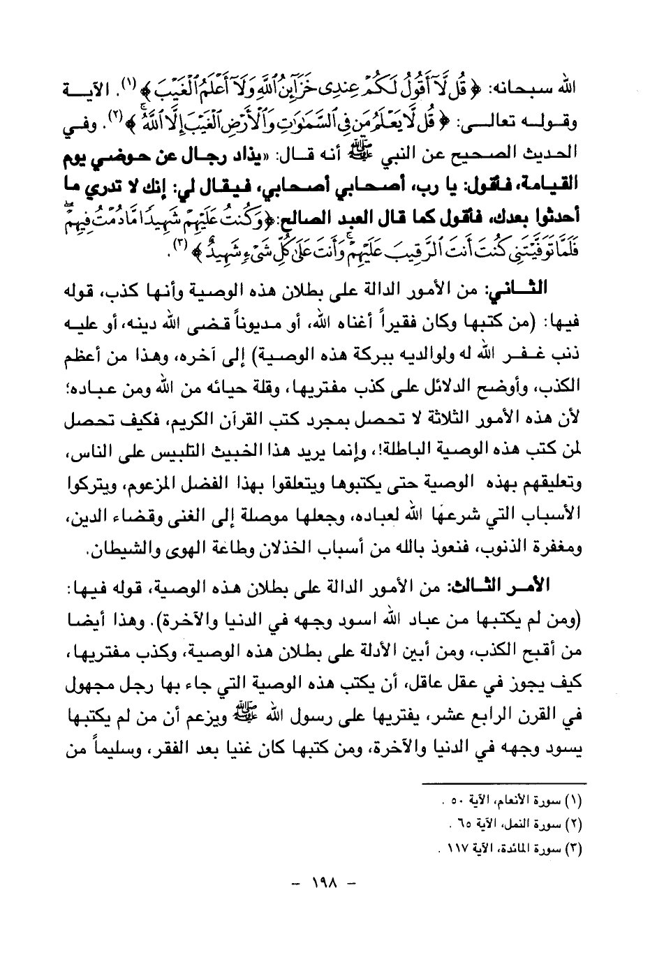 الثاني: من الأمور الدالة على بطلان هذه الوصية وأنها كذب، قوله فيها: (من كتبها وكان فقيرا أغناه الله، أو مديونا قضى الله دينه، أو عليه ذنب غفر الله له ولوالديه ببركة هذه الوصية) إلى آخره، وهذا من أعظم الكذب، وأوضح الدلائل على كذب مفتريها، وقلة حيائه من الله ومن عباده؛ لأن هذه الأمور الثلاثة لا تحصل بمجرد كتب القرآن الكريم، فكيف تحصل لمن كتب هذه الوصية الباطلة!، وإنما يريد هذا الخبيث التلبيس على الناس، وتعليقهم بهذه الوصية حتى يكتبوها ويتعلقوا بهذا الفضل المزعوم، ويتركوا الأسباب التي شرعها الله لعباده، وجعلها موصلة إلى الغنى وقضاء الدين، ومغفرة الذنوب، فنعوذ بالله من أسباب الخذلان وطاعة الهوى والشيطان.