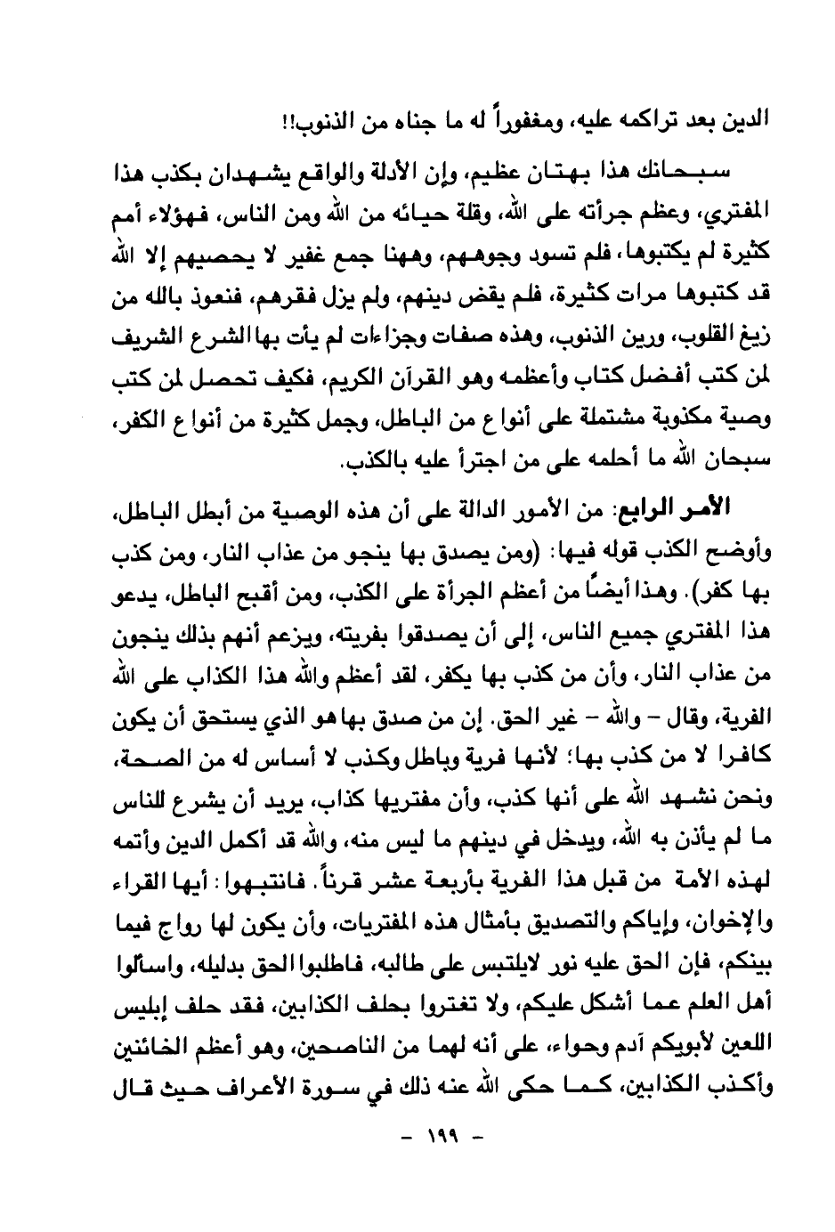 الأمر الرابع: من الأمور الدالة على أن هذه الوصية من أبطل الباطل، وأوضح الكذب قوله فيها: (ومن يصدق بها ينجو من عذاب النار، ومن كذب بها كفر) ، وهذا أيضا من أعظم الجرأة على الكذب، ومن أقبح الباطل، يدعو هذا المفتري جميع الناس، إلى أن يصدقوا بفريته، ويزعم أنهم بذلك ينجون من عذاب النار، وأن من كذب بها يكفر، لقد أعظم والله هذا الكذاب على الله الفرية، وقال - والله - غير الحق. إن من صدق بها هو الذي يستحق أن يكون كافرا لا من كذب بها؛ لأنها فرية وباطل وكذب لا أساس له من الصحة، ونحن نشهد الله على أنها كذب، وأن مفتريها كذاب، يريد أن يشرع للناس ما لم يأذن به الله، ويدخل في دينهم ما ليس منه، والله قد أكمل الدين وأتمه لهذه الأمة من قبل هذه الفرية بأربعة عشر قرنا فانتبهوا: أيها القراء والإخوان، وإياكم والتصديق بأمثال هذه المفتريات، وأن يكون لها رواج فيما بينكم، فإن الحق عليه نور لا يلتبس على طالبه، فاطلبوا الحق بدليله، واسألوا أهل العلم عما أشكل عليكم، ولا تغتروا بحلف الكذابين، فقد حلف إبليس اللعين لأبويكم آدم وحواء، على أنه لهما من الناصحين، وهو أعظم الخائنين وأكذب الكذابين، كما حكى الله عنه ذلك في سورة الأعراف حيث قال