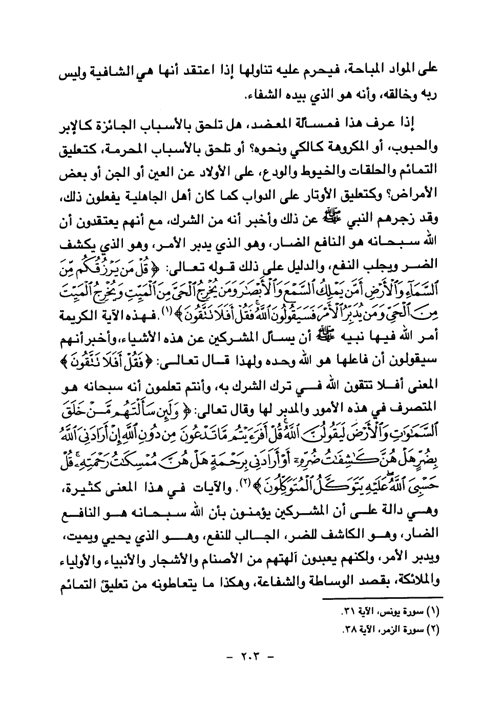إذا عرف هذا فمسألة المعضد، هل تلحق بالأسباب الجائزة كالإبر والحبوب، أو المكروهة كالكي ونحوه؟ أو تلحق بالأسباب المحرمة، كتعليق التمائم والحلقات والخيوط والودع، على الأولاد عن العين أو الجن أو بعض الأمراض؟ وكتعليق الأوتار على الدواب كما كان أهل الجاهلية يفعلون ذلك، وقد زجرهم النبي صلى الله عليه وسلم عن ذلك وأخبر أنه من الشرك، مع أنهم يعتقدون أن الله سبحانه هو النافع الضار، وهو الذي يدبر الأمر، وهو الذي يكشف الضر ويجلب النفع، والدليل على ذلك قوله تعالى: {قُلْ مَنْ يَرْزُقُكُمْ مِنَ السَّمَاءِ وَالْأَرْضِ أَمَّنْ يَمْلِكُ السَّمْعَ وَالْأَبْصَارَ وَمَنْ يُخْرِجُ الْحَيَّ مِنَ الْمَيِّتِ وَيُخْرِجُ الْمَيِّتَ مِنَ الْحَيِّ وَمَنْ يُدَبِّرُ الْأَمْرَ فَسَيَقُولُونَ اللَّهُ فَقُلْ أَفَلَا تَتَّقُونَ} (¬1) فهذه الآية الكريمة أمر الله فيها نبيه صلى الله عليه وسلم أن يسأل المشركين عن هذه الأشياء وأخبر أنهم سيقولون أن فاعلها هو الله وحده ولهذا قال تعالى: {فَقُلْ أَفَلَا تَتَّقُونَ} (¬2) المعنى أفلا تتقون الله في ترك الشرك به، وأنتم تعلمون أنه سبحانه هو المتصرف في هذه الأمور والمدبر لها وقال تعالى: {وَلَئِنْ سَأَلْتَهُمْ مَنْ خَلَقَ السَّمَاوَاتِ وَالْأَرْضَ لَيَقُولُنَّ اللَّهُ قُلْ أَفَرَأَيْتُمْ مَا تَدْعُونَ مِنْ دُونِ اللَّهِ إِنْ أَرَادَنِيَ اللَّهُ بِضُرٍّ هَلْ هُنَّ كَاشِفَاتُ ضُرِّهِ أَوْ أَرَادَنِي بِرَحْمَةٍ هَلْ هُنَّ مُمْسِكَاتُ رَحْمَتِهِ قُلْ حَسْبِيَ اللَّهُ عَلَيْهِ يَتَوَكَّلُ الْمُتَوَكِّلُونَ} (¬3) والآيات في هذا المعنى كثيرة، وهي دالة على أن المشركين يؤمنون بأن الله سبحانه هو النافع الضار، وهو الكاشف للضر، الجالب للنفع، وهو الذي يحيي ويميت، ويدبر الأمر، ولكنهم يعبدون آلهتهم من الأصنام والأشجار والأنبياء والأولياء والملائكة، بقصد الوساطة والشفاعة، وهكذا ما يتعاطونه من تعليق التمائم