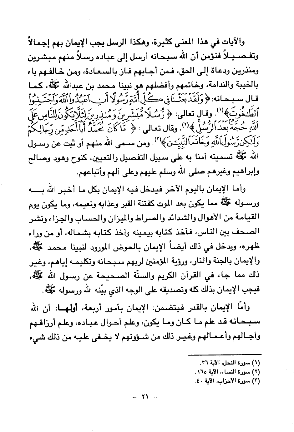والآيات في هذا المعنى كثيرة، وهكذا الرسل يجب الإيمان بهم إجمالا وتفصيلا فنؤمن أن الله سبحانه أرسل إلى عباده رسلا منهم مبشرين ومنذرين ودعاة إلى الحق، فمن أجابهم فاز بالسعادة، ومن خالفهم باء بالخيبة والندامة، وخاتمهم وأفضلهم هو نبينا محمد بن عبد الله صلى الله عليه وسلم، كما قال سبحانه: {وَلَقَدْ بَعَثْنَا فِي كُلِّ أُمَّةٍ رَسُولًا أَنِ اُعْبُدُوا اللَّهَ وَاجْتَنِبُوا الطَّاغُوتَ} (¬1) وقال تعالى: {رُسُلًا مُبَشِّرِينَ وَمُنْذِرِينَ لِئَلَّا يَكُونَ لِلنَّاسِ عَلَى اللَّهِ حُجَّةٌ بَعْدَ الرُّسُلِ} (¬2) وقال تعالى: {مَا كَانَ مُحَمَّدٌ أَبَا أَحَدٍ مِنْ رِجَالِكُمْ وَلَكِنْ رَسُولَ اللَّهِ وَخَاتَمَ النَّبِيِّينَ} (¬3) ومن سمى الله منهم أو ثبت عن رسول الله صلى الله عليه وسلم تسميته آمنا به على سبيل التفصيل والتعيين، كنوح وهود وصالح وإبراهيم وغيرهم صلى الله وسلم عليهم وعلى آلهم وأتباعهم.
