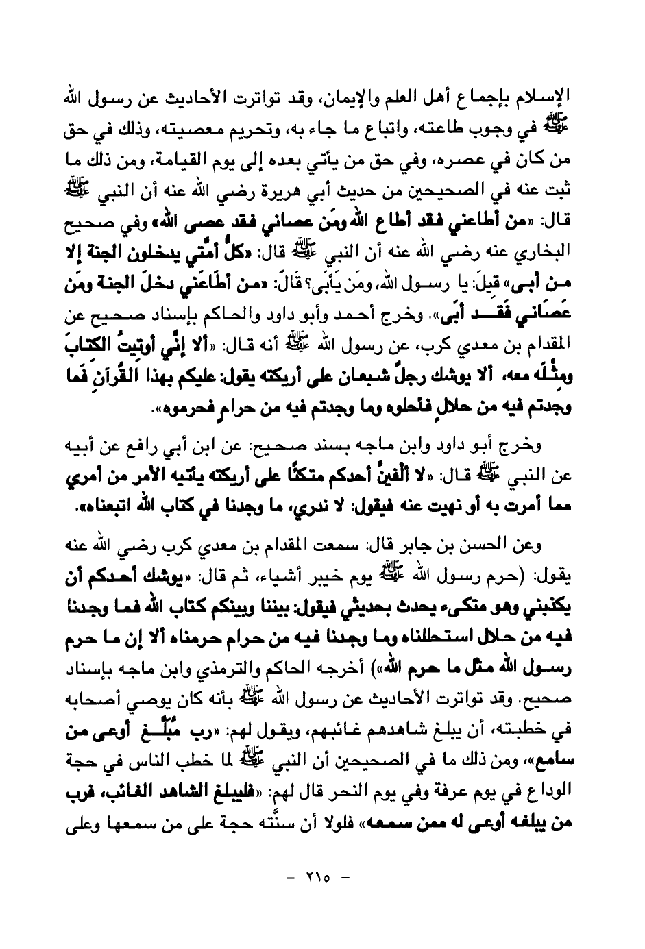 الإسلام بإجماع أهل العلم والإيمان، وقد تواترت الأحاديث عن رسول الله صلى الله عليه وسلم في وجوب طاعته، واتباع ما جاء به، وتحريم معصيته، وذلك في حق من كان في عصره، وفي حق من يأتي بعده إلى يوم القيامة، ومن ذلك ما ثبت عنه في الصحيحين من حديث أبي هريرة رضي الله عنه أن النبي صلى الله عليه وسلم قال: «من أطاعني فقد أطاع الله ومن عصاني فقد عصى الله (¬1) » وفي صحيح البخاري عنه رضي الله عنه أن النبي صلى الله عليه وسلم قال: «كل أمتي يدخلون الجنة إلا من أبى قيل يا رسول الله ومن يأبى؟ قال من أطاعني دخل الجنة ومن عصاني فقد أبى (¬2) » . وخرج أحمد وأبو داود والحاكم بإسناد صحيح عن المقدام بن معدي كرب، عن رسول الله صلى الله عليه وسلم أنه قال: «ألا إني أوتيت الكتاب ومثله معه ألا يوشك رجل شبعان على أريكته يقول: عليكم بهذا القرآن فما وجدتم فيه من حلال فأحلوه وما وجدتم فيه من حرام فحرموه (¬3) » .