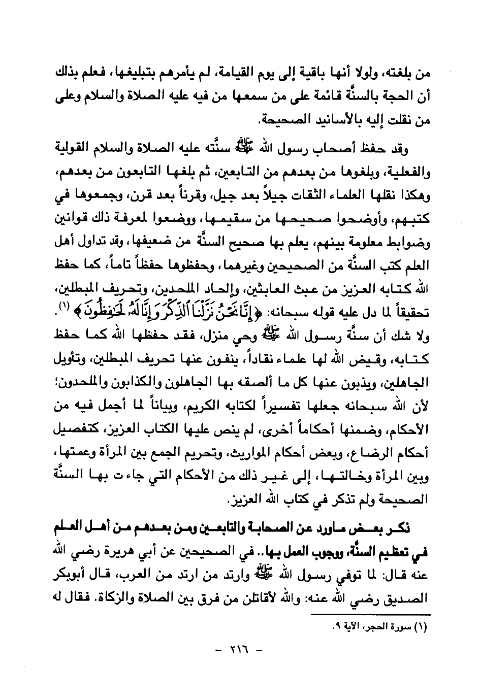 ذكر بعض ما ورد من الصحابة والتابعين ومن بعدهم من أهل العلم في تعظيم السنة، ووجوب العمل بها.. في الصحيحين عن أبي هريرة رضي الله عنه قال: «لما توفي رسول الله صلى الله عليه وسلم وارتد من ارتد من العرب، قال أبو بكر الصديق رضي الله عنه: والله لأقاتلن من فرق بين الصلاة والزكاة فقال له