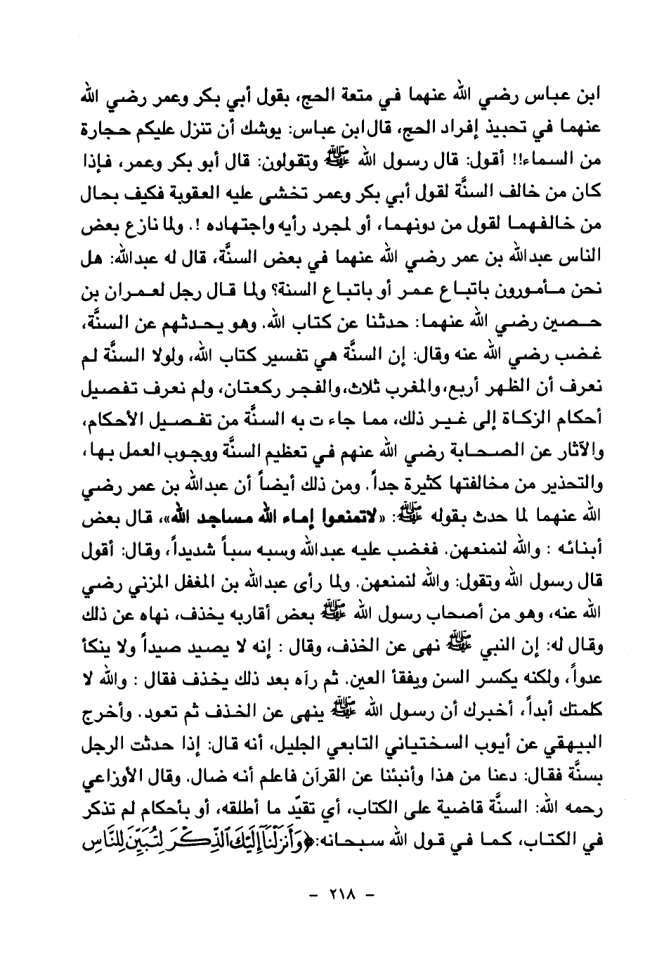 ولما نازع بعض الناس عبد الله بن عمر رضي الله عنهما في بعض السنة، قال له عبد الله: هل نحن مأمورون باتباع عمر أو باتباع السنة؟ ولما قال رجل لعمران بن حصين رضي الله عنهما: حدثنا عن كتاب الله. وهو يحدثهم عن السنة، غضب رضي الله عنه وقال: إن السنة هي تفسير كتاب الله، ولولا السنة لم نعرف أن الظهر أربع، والمغرب ثلاث، والفجر ركعتان، ولم نعرف تفصيل أحكام الزكاة إلى غير ذلك، مما جاءت به السنة من تفصيل الأحكام، والآثار عن الصحابة رضي الله عنهم في تعظيم السنة ووجوب العمل بها، والتحذير من مخالفتها كثيرة جدا. ومن ذلك أيضا أن عبد الله بن عمر رضي الله عنهما لما حدث بقوله صلى الله عليه وسلم: «لا تمنعوا إماء الله مساجد الله (¬1) » قال بعض أبنائه: والله لنمنعهن. فغضب عليه عبد الله وسبه سبا شديدا، وقال: أقول قال رسول الله وتقول: والله لنمنعهن.