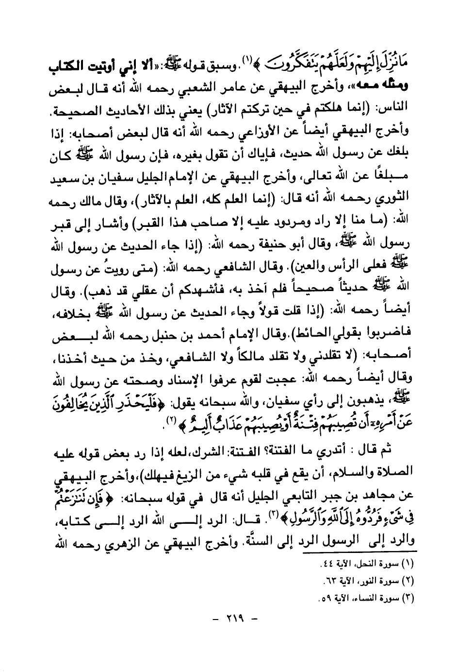 وسبق قوله صلى الله عليه وسلم: «ألا إني أوتيت الكتاب ومثله معه (¬1) » وأخرج البيهقي عن عامر الشعبي رحمه الله أنه قال لبعض الناس: (إنما هلكتم في حين تركتم الآثار) يعني بذلك الأحاديث الصحيحة.