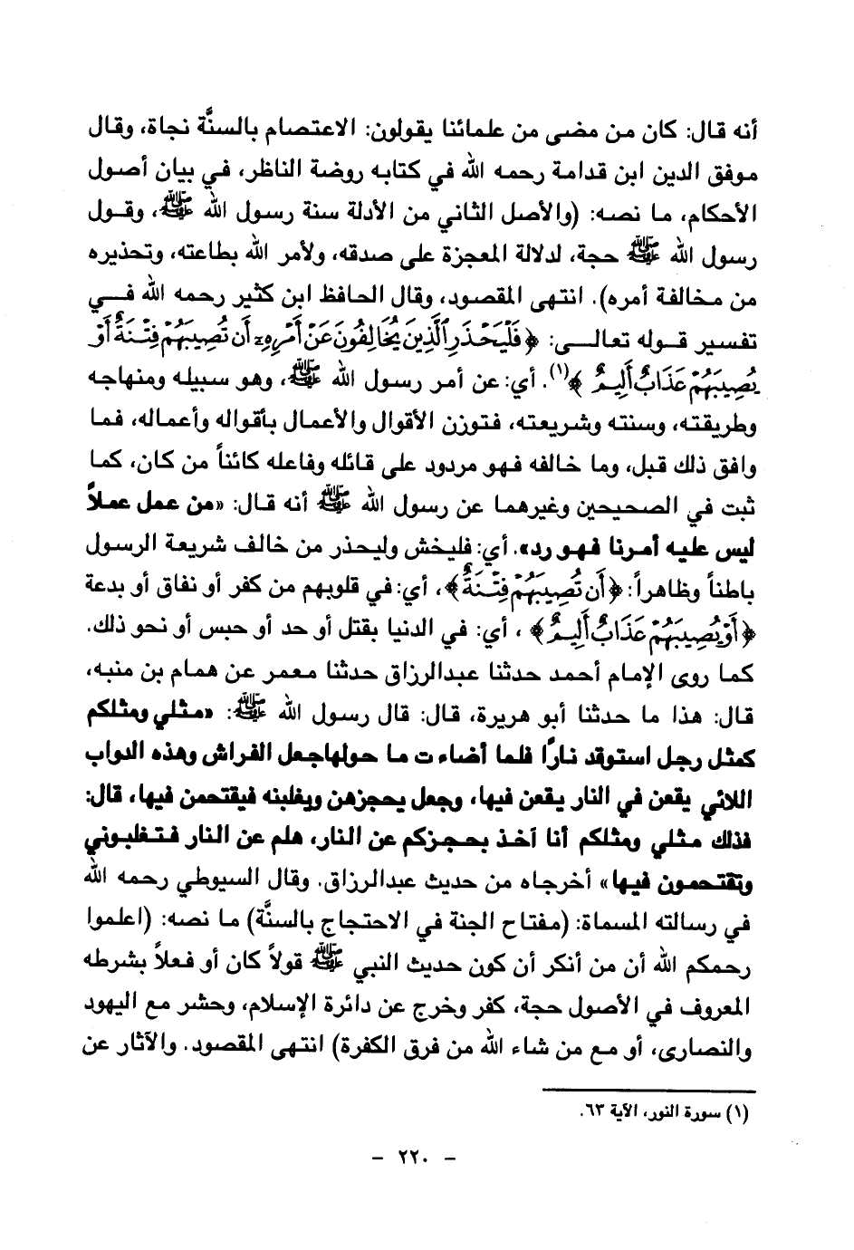 أنه قال: كان من مضى من علمائنا يقولون: الاعتصام بالسنة نجاة، وقال موفق الدين ابن قدامة رحمه الله في كتابه روضة الناظر، في بيان أصول الأحكام، ما نصه: (والأصل الثاني من الأدلة سنة رسول الله صلى الله عليه وسلم، وقول رسول الله صلى الله عليه وسلم حجة، لدلالة المعجزة على صدقه، ولأمر الله بطاعته، وتحذيره من مخالفة أمره) . انتهى المقصود، وقال الحافظ ابن كثير رحمه الله في تفسير قوله تعالى: {فَلْيَحْذَرِ الَّذِينَ يُخَالِفُونَ عَنْ أَمْرِهِ أَنْ تُصِيبَهُمْ فِتْنَةٌ أَوْ يُصِيبَهُمْ عَذَابٌ أَلِيمٌ} (¬1) أي: عن أمر رسول الله صلى الله عليه وسلم، وهو سبيله ومنهاجه وطريقته، وسنته وشريعته، فتوزن الأقوال والأعمال بأقواله وأعماله، فما وافق ذلك قبل، وما خالفه فهو مردود على قائله وفاعله كائنا من كان، كما ثبت في الصحيحين وغيرهما عن رسول الله صلى الله عليه وسلم أنه قال: «من عمل عملا ليس عليه أمرنا فهو رد (¬2) » . أي: فليخش وليحذر من خالف شريعة الرسول باطنا وظاهرا: {أَنْ تُصِيبَهُمْ فِتْنَةٌ} (¬3) أي: في قلوبهم من كفر أو نفاق أو بدعة {أَوْ يُصِيبَهُمْ عَذَابٌ أَلِيمٌ} (¬4) أي: في الدنيا بقتل أو حد أو حبس أو نحو ذلك. كما روى الإمام أحمد حدثنا عبد الرزاق حدثنا معمر عن همام بن منبه، قال: هذا ما حدثنا أبو هريرة، قال: قال رسول الله صلى الله عليه وسلم: «مثلي ومثلكم كمثل رجل استوقد نارا فلما أضاءت ما حولها جعل الفراش وهذه الدواب اللائي يقعن في النار يقعن فيها وجعل يحجزهن ويغلبنه فيقتحمن فيها، قال: فذلك مثلي ومثلكم أنا آخذ بحجزكم عن النار، هلم عن النار فتغلبوني وتقتحمون فيها (¬5) » أخرجاه من حديث عبد الرزاق.