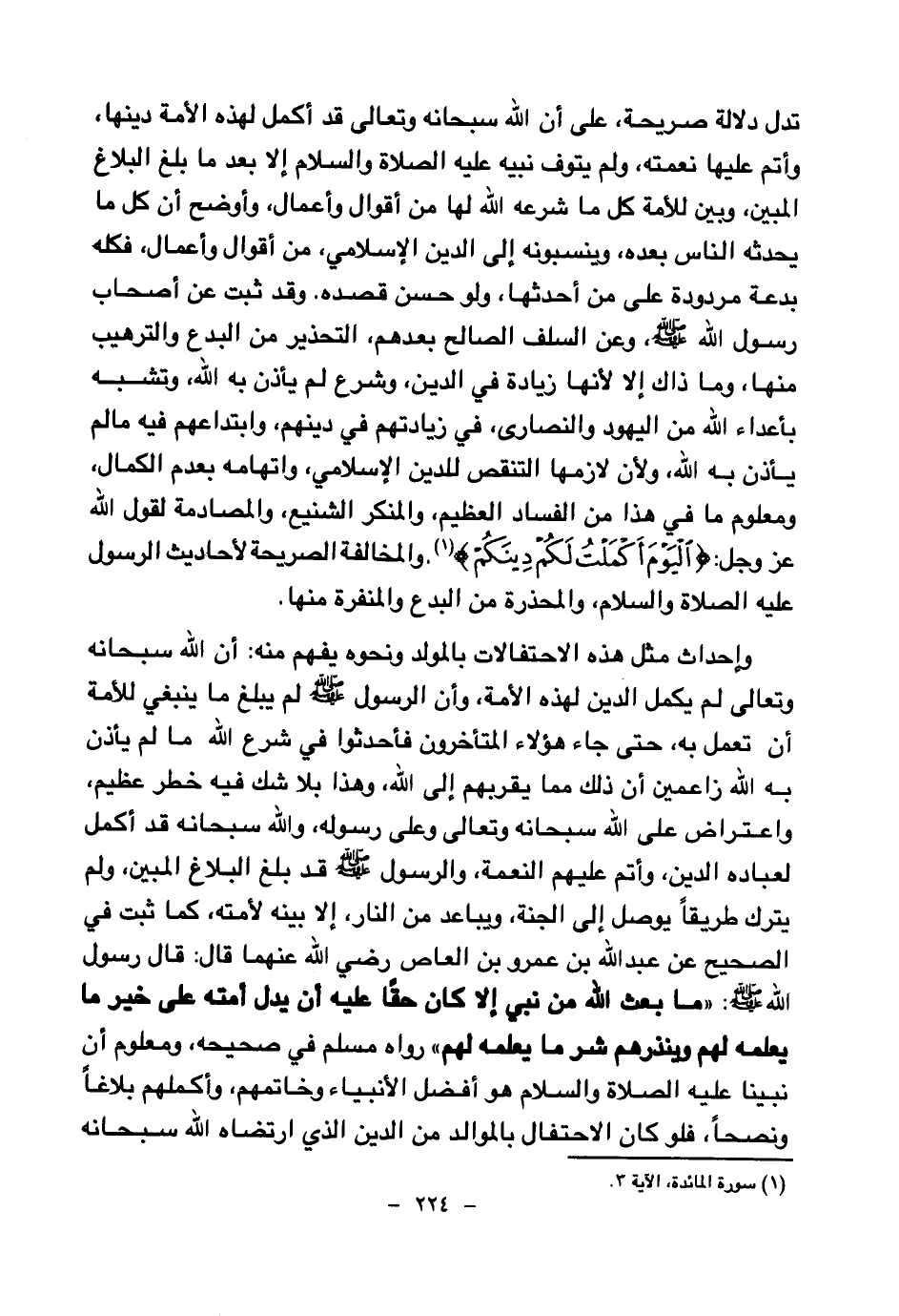 تدل دلالة صريحة، على أن الله سبحانه وتعالى قد أكمل لهذه الأمة دينها، وأتم عليها نعمته، ولم يتوف نبيه عليه الصلاة والسلام إلا بعد ما بلغ البلاغ المبين، وبين للأمة كل ما شرعه الله لها من أقوال وأعمال، وأوضح أن كل ما يحدثه الناس بعده، وينسبونه إلى الدين الإسلامي، من أقوال وأعمال، فكله بدعة مردودة على من أحدثها، ولو حسن قصده.