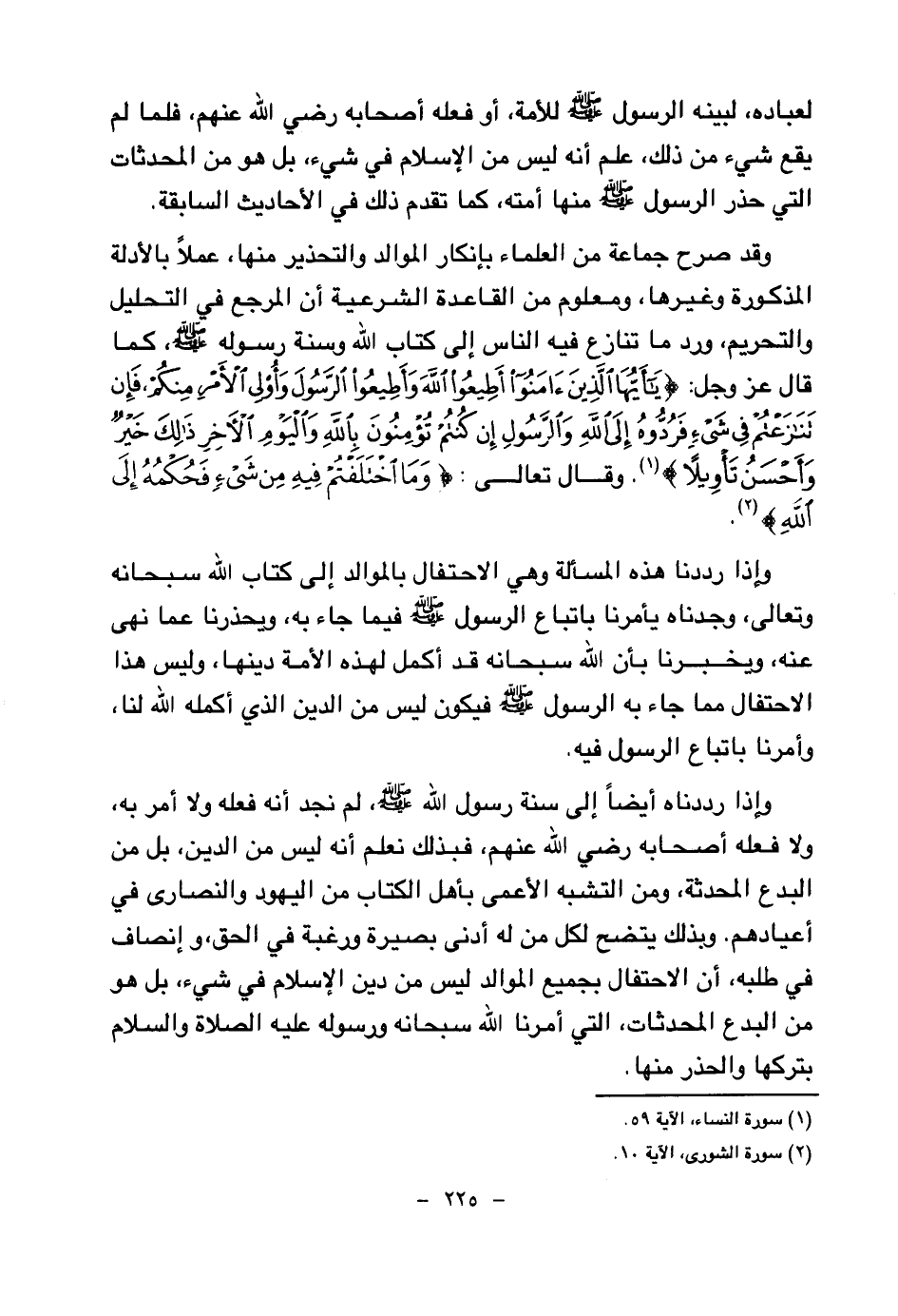 وقد صرح جماعة من العلماء بإنكار الموالد والتحذير منها، عملا بالأدلة المذكورة وغيرها، ومعلوم من القاعدة الشرعية أن المرجع في التحليل والتحريم، ورد ما تنازع فيه الناس إلى كتاب الله وسنة رسوله صلى الله عليه وسلم، كما قال عز وجل: {يَا أَيُّهَا الَّذِينَ آمَنُوا أَطِيعُوا اللَّهَ وَأَطِيعُوا الرَّسُولَ وَأُولِي الْأَمْرِ مِنْكُمْ فَإِنْ تَنَازَعْتُمْ فِي شَيْءٍ فَرُدُّوهُ إِلَى اللَّهِ وَالرَّسُولِ إِنْ كُنْتُمْ تُؤْمِنُونَ بِاللَّهِ وَالْيَوْمِ الْآخِرِ ذَلِكَ خَيْرٌ وَأَحْسَنُ تَأْوِيلًا} (¬1) وقال تعالى: {وَمَا اخْتَلَفْتُمْ فِيهِ مِنْ شَيْءٍ فَحُكْمُهُ إِلَى اللَّهِ} (¬2)