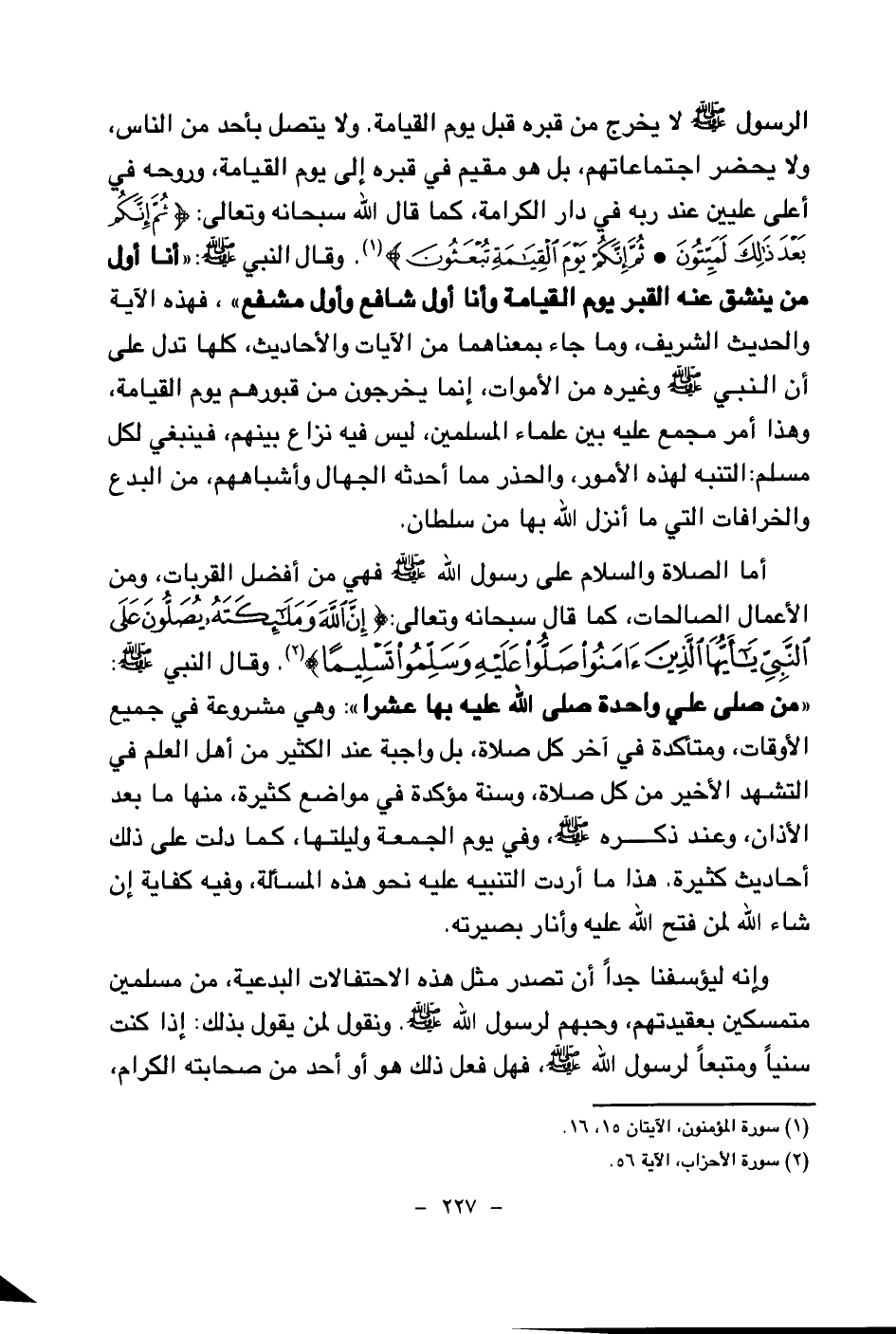 أما الصلاة والسلام على رسول الله صلى الله عليه وسلم فهي من أفضل القربات، ومن الأعمال الصالحات، كما قال سبحانه وتعالى: {إِنَّ اللَّهَ وَمَلَائِكَتَهُ يُصَلُّونَ عَلَى النَّبِيِّ يَا أَيُّهَا الَّذِينَ آمَنُوا صَلُّوا عَلَيْهِ وَسَلِّمُوا تَسْلِيمًا} (¬4) وقال النبي صلى الله عليه وسلم: «من صلى علي واحدة صلى الله عليه بها عشرا (¬5) » وهي مشروعة في جميع الأوقات، ومتأكدة في آخر كل صلاة، بل واجبة عند الكثير من أهل العلم في التشهد الأخير من كل صلاة، وسنة مؤكدة في مواضع كثيرة، منها ما بعد الأذان، وعند ذكره صلى الله عليه وسلم، وفي يوم الجمعة وليلتها، كما دلت على ذلك أحاديث كثيرة. هذا ما أردت التنبيه عليه نحو هذه المسألة، وفيه كفاية إن شاء الله لمن فتح الله عليه وأنار بصيرته.