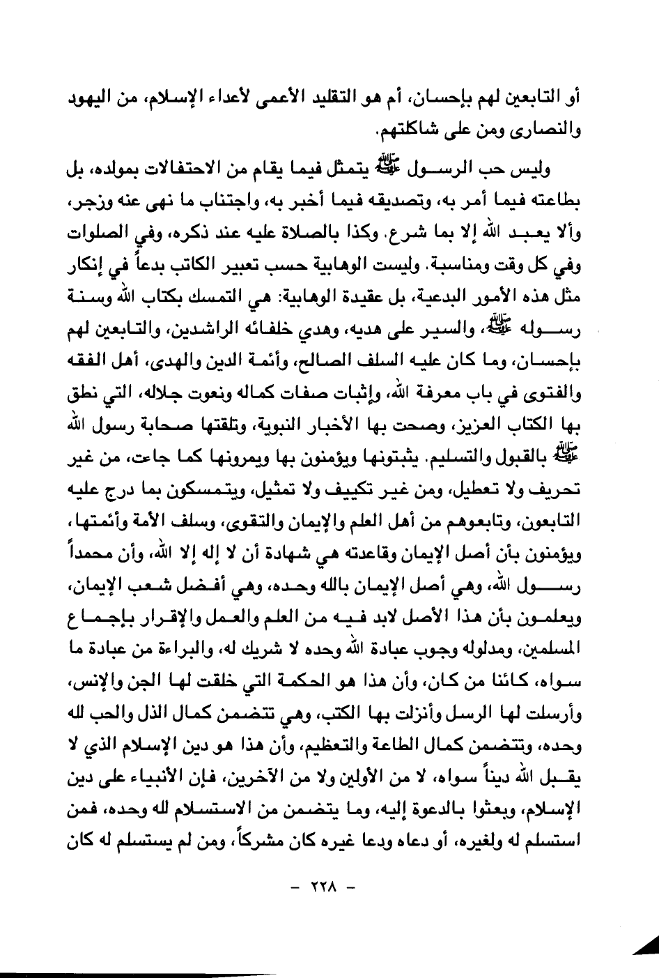 وليس حب الرسول صلى الله عليه وسلم يتمثل فيما يقام من احتفالات بمولده، بل بطاعته فيما أمر به، وتصديقه فيما أخبر به، واجتناب ما نهى عنه وزجر، وألا يعبد الله إلا بما شرع. وكذا بالصلاة عليه عند ذكره، وفي الصلوات وفي كل وقت ومناسبة. وليست الوهابية حسب تعبير الكاتب بدعا في إنكار مثل هذه الأمور البدعية، بل عقيدة الوهابية: هي التمسك بكتاب الله وسنة رسوله صلى الله عليه وسلم، والسير على هديه، وهدي خلفائه الراشدين، والتابعين لهم بإحسان، وما كان عليه السلف الصالح، وأئمة الدين والهدى، أهل الفقه والفتوى في باب معرفة الله، وإثبات صفات كماله ونعوت جلاله، التي نطق بها الكتاب العزيز، وصحت بها الأخبار النبوية، وتلقتها صحابة رسول الله صلى الله عليه وسلم بالقبول والتسليم. يثبتونها ويؤمنون بها ويمرونها كما جاءت، من غير تحريف ولا تعطيل، ومن غير تكييف ولا تمثيل، ويتمسكون بما درج عليه التابعون، وتابعوهم من أهل العلم والإيمان والتقوى، وسلف الأمة وأئمتها، ويؤمنون بأن أصل الإيمان وقاعدته هي شهادة أن لا إله إلا الله، وأن محمدا رسول الله، وهي أصل الإيمان بالله وحده، وهي أفضل شعب الإيمان، ويعلمون بأن هذا الأصل لا بد فيه من العلم والعمل والإقرار بإجماع المسلمين، ومدلوله وجوب عبادة الله وحده لا شريك له، والبراءة من عبادة ما سواه، كائنا من كان، وأن هذا هو الحكمة التي خلقت لها الجن والإنس، وأرسلت لها الرسل وأنزلت بها الكتب، وهي تتضمن كمال الذل والحب لله وحده، وتتضمن كمال الطاعة والتعظيم، وأن هذا هو دين الإسلام الذي لا يقبل الله دينا سواه، لا من الأولين ولا من الآخرين، فإن الأنبياء على دين الإسلام، وبعثوا بالدعوة إليه، وما يتضمن من الاستسلام لله وحده، فمن استسلم له ولغيره، أو دعاه ودعا غيره كان مشركا، ومن لم يستسلم له كان