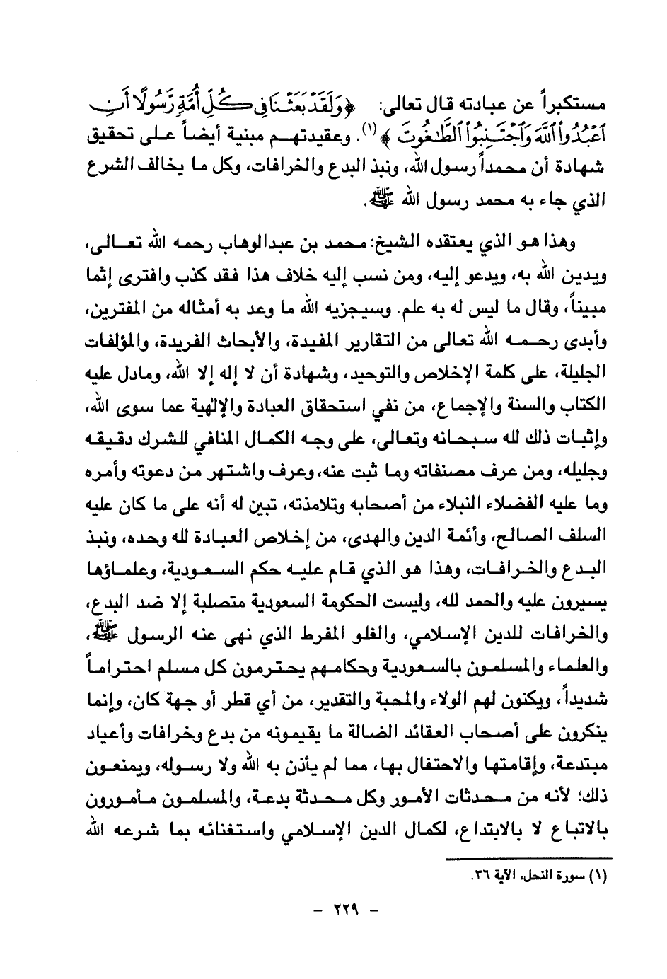 وعقيدتهم مبنية أيضا على تحقيق شهادة أن محمدا رسول الله، ونبذ البدع والخرافات، وكل ما يخالف الشرع الذي جاء به محمد رسول الله صلى الله عليه وسلم. وهذا هو الذي يعتقده الشيخ: محمد بن عبد الوهاب رحمه الله تعالى، ويدين لله به، ويدعو إليه، ومن نسب إليه خلاف هذا فقد كذب وافترى إثما مبينا، وقال ما ليس له به علم. وسيجزيه الله ما وعد به أمثاله من المفترين، وأبدى رحمه الله تعالى من التقارير المفيدة، والأبحاث الفريدة، والمؤلفات الجليلة، على كلمة الإخلاص والتوحيد، وشهادة أن لا إله إلا الله، وما دل عليه الكتاب والسنة والإجماع، من نفي استحقاق العبادة والإلهية عما سوى الله، وإثبات ذلك لله سبحانه وتعالى، على وجه الكمال المنافي للشرك دقيقه وجليله، ومن عرف مصنفاته وما ثبت عنه، وعرف واشتهر من دعوته وأمره وما عليه الفضلاء النبلاء من أصحابه وتلامذته، تبين له أنه على ما كان عليه السلف الصالح، وأئمة الدين والهدى، من إخلاص العبادة لله وحده، ونبذ البدع والخرافات، وهذا هو الذي قام عليه حكم السعودية، وعلماؤها يسيرون عليه والحمد لله، وليست الحكومة السعودية متصلبة إلا ضد البدع، والخرافات للدين الإسلامي، والغلو المفرط الذي نهى عنه الرسول صلى الله عليه وسلم، والعلماء والمسلمون بالسعودية وحكامهم يحترمون كل مسلم احتراما شديدا، ويكنون لهم الولاء والمحبة والتقدير، من أي قطر أو جهة كان، وإنما ينكرون على أصحاب العقائد الضالة ما يقيمونه من بدع وخرافات وأعياد مبتدعة، وإقامتها والاحتفال بها، مما لم يأذن به الله ولا رسوله، ويمنعون ذلك؛ لأنه من محدثات الأمور وكل محدثة بدعة، والمسلمون مأمورون بالاتباع لا بالابتداع، لكمال الدين الإسلامي واستغنائه بما شرعه الله
