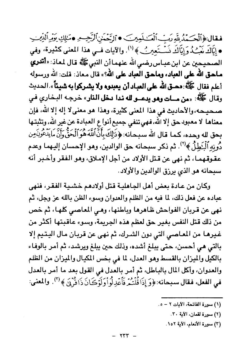 وكان من عادة بعض أهل الجاهلية قتل أولادهم خشية الفقر، فنهى عباده عن فعل ذلك، لما فيه من الظلم والعدوان وسوء الظن بالله عز وجل، ثم نهى عن قربان الفواحش ظاهرها وباطنها، وهي المعاصي كلها، ثم خص من ذلك قتل النفس بغير حق لعظم هذه الجريمة، وسوء عاقبتها أكثر من غيرها من المعاصي التي دون الشرك، ثم نهى عن قربان مال اليتيم إلا بالتي هي أحسن، حتى يبلغ أشده، وذلك حين يبلغ ويرشد، ثم أمر بالوفاء بالكيل والميزان بالقسط وهو العدل، لما في بخس المكيال والميزان من الظلم والعدوان، وأكل المال بالباطل، ثم أمر بالعدل في القول بعد ما أمر بالعدل في الفعل، فقال سبحانه: {وَإِذَا قُلْتُمْ فَاعْدِلُوا وَلَوْ كَانَ ذَا قُرْبَى} (¬7) والمعنى:
