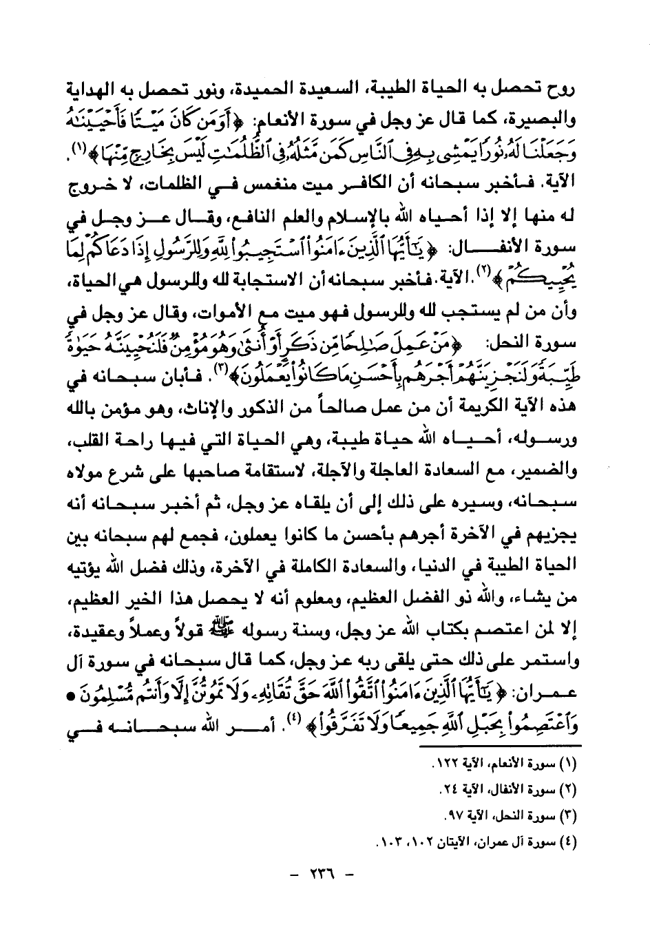 وقال عز وجل في سورة النحل: {مَنْ عَمِلَ صَالِحًا مِنْ ذَكَرٍ أَوْ أُنْثَى وَهُوَ مُؤْمِنٌ فَلَنُحْيِيَنَّهُ حَيَاةً طَيِّبَةً وَلَنَجْزِيَنَّهُمْ أَجْرَهُمْ بِأَحْسَنِ مَا كَانُوا يَعْمَلُونَ} (¬3) فأبان سبحانه في هذه الآية الكريمة أن من عمل صالحا من الذكور والإناث، وهو مؤمن بالله ورسوله، أحياه الله حياة طيبة، وهي الحياة التي فيها راحة القلب، والضمير، مع السعادة العاجلة والآجلة، لاستقامة صاحبها على شرع مولاه سبحانه، وسيره على ذلك إلى أن يلقاه عز وجل، ثم أخبر سبحانه أنه يجزيهم في الآخرة أجرهم بأحسن ما كانوا يعملون، فجمع لهم سبحانه بين الحياة الطيبة في الدنيا، والسعادة الكاملة في الآخرة، وذلك فضل الله يؤتيه من يشاء والله ذو الفضل العظيم، ومعلوم أنه لا يحصل هذا الخير العظيم، إلا لمن اعتصم بكتاب الله عز وجل، وسنة رسوله صلى الله عليه وسلم قولا وعملا وعقيدة، واستمر على ذلك حتى يلقى ربه عز وجل، كما قال سبحانه في سورة آل عمران: {يَا أَيُّهَا الَّذِينَ آمَنُوا اتَّقُوا اللَّهَ حَقَّ تُقَاتِهِ وَلَا تَمُوتُنَّ إِلَّا وَأَنْتُمْ مُسْلِمُونَ} (¬4) {وَاعْتَصِمُوا بِحَبْلِ اللَّهِ جَمِيعًا وَلَا تَفَرَّقُوا} (¬5) أمر الله سبحانه في