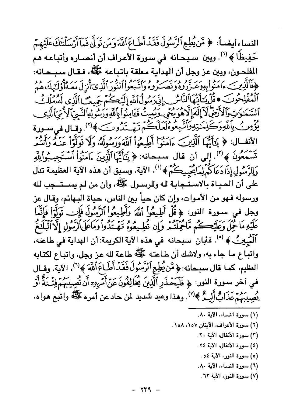 وبين سبحانه في سورة الأعراف أن أنصاره وأتباعه هم المفلحون، وبين عز وجل أن الهداية معلقة باتباعه صلى الله عليه وسلم، فقال سبحانه: {فَالَّذِينَ آمَنُوا بِهِ وَعَزَّرُوهُ وَنَصَرُوهُ وَاتَّبَعُوا النُّورَ الَّذِي أُنْزِلَ مَعَهُ أُولَئِكَ هُمُ الْمُفْلِحُونَ} (¬2) {قُلْ يَا أَيُّهَا النَّاسُ إِنِّي رَسُولُ اللَّهِ إِلَيْكُمْ جَمِيعًا الَّذِي لَهُ مُلْكُ السَّمَاوَاتِ وَالْأَرْضِ لَا إِلَهَ إِلَّا هُوَ يُحْيِي وَيُمِيتُ فَآمِنُوا بِاللَّهِ وَرَسُولِهِ النَّبِيِّ الْأُمِّيِّ الَّذِي يُؤْمِنُ بِاللَّهِ وَكَلِمَاتِهِ وَاتَّبِعُوهُ لَعَلَّكُمْ تَهْتَدُونَ} (¬3)