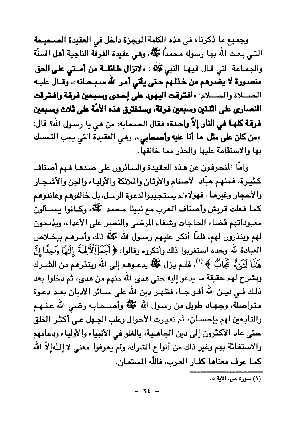 وجميع ما ذكرناه في هذه الكلمة الموجزة داخل في العقيدة الصحيحة التي بعث الله بها رسوله محمدا صلى الله عليه وسلم، وهي عقيدة الفرقة الناجية أهل السنة والجماعة التي قال فيها النبي صلى الله عليه وسلم: «لا تزال طائفة من أمتي على الحق منصورة لا يضرهم من خذلهم حتى يأتي أمر الله سبحانه (¬1) » وقال عليه الصلاة والسلام: «افترقت اليهود على إحدى وسبعين فرقة وافترقت النصارى على اثنتين وسبعين فرقة وستفترق هذه الأمة على ثلاث وسبعين فرقة كلها في النار إلا واحدة. فقال الصحابة: من هي يا رسول الله؟ قال "من كان على مثل ما أنا عليه وأصحابي (¬2) » وهي العقيدة التي يجب التمسك بها والاستقامة عليها والحذر مما خالفها.