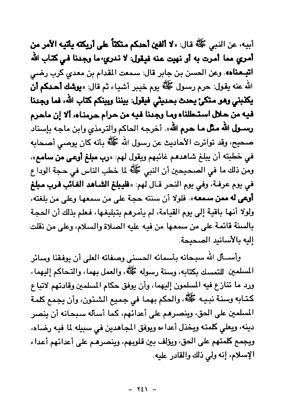 وأسأل الله سبحانه بأسمائه الحسنى وصفاته العلى أن يوفقنا وسائر المسلمين للتمسك بكتابه، وسنة رسوله صلى الله عليه وسلم، والعمل بهما، والتحاكم إليهما، ورد ما تنازع فيه المسلمون إليهما، وأن يوفق حكام المسلمين وقادتهم لاتباع كتابه وسنة نبيه صلى الله عليه وسلم، والحكم بهما في جميع الشئون، وأن يجمع كلمة المسلمين على الحق، وينصرهم على أعدائهم، كما اسأله سبحانه أن ينصر دينه، ويعلى كلمته ويخذل أعداؤه ويوفق المجاهدين في سبيله لما فيه رضاه، ويجمع كلمتهم على الحق، ويؤلف بين قلوبهم، وينصرهم على أعدائهم أعداء الإسلام، إنه ولي ذلك والقادر عليه.