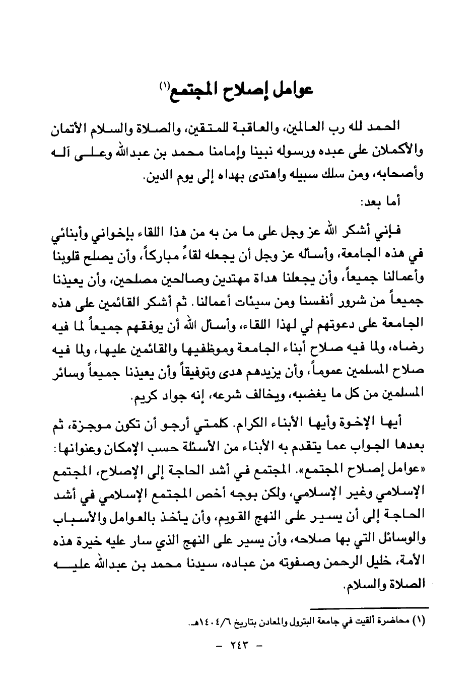 فإني أشكر الله عز وجل على ما من به من هذا اللقاء بإخواني وأبنائي في هذه الجامعة، وأسأله عز وجل أن يجعله لقاء مباركا، وأن يصلح قلوبنا وأعمالنا جميعا، وأن يجعلنا هداة مهتدين وصالحين مصلحين، وأن يعيذنا جميعا من شرور أنفسنا ومن سيئات أعمالنا. ثم أشكر القائمين على هذه الجامعة على دعوتهم لي لهذا اللقاء، وأسأل الله أن يوفقهم جميعا لما فيه رضاه، ولما فيه صلاح أبناء الجامعة وموظفيها والقائمين عليها، ولما فيه صلاح المسلمين عموما، وأن يزيدهم هدى وتوفيقا وأن يعيذنا جميعا وسائر المسلمين من كل ما يغضبه، ويخالف شرعه، إنه جواد كريم.