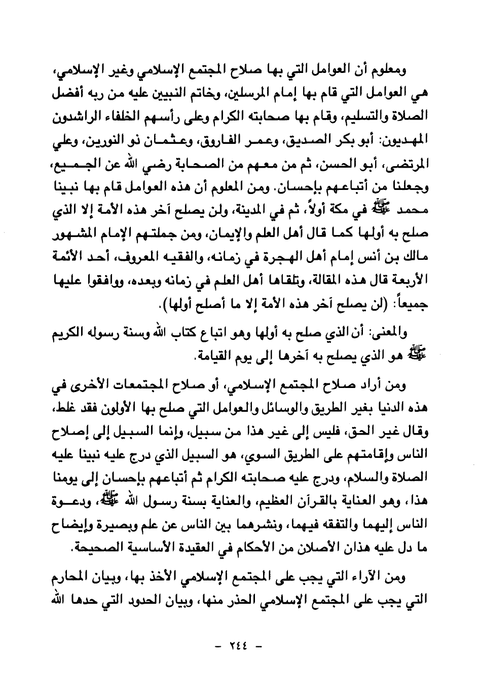 ومعلوم أن العوامل التي بها صلاح المجتمع الإسلامي وغير الإسلامي، هي العوامل التي قام بها إمام المرسلين، وخاتم النبيين عليه من ربه أفضل الصلاة والتسليم، وقام بها صحابته الكرام وعلى رأسهم الخلفاء الراشدون المهديون: أبو بكر الصديق، وعمر الفاروق، وعثمان ذو النورين، وعلي المرتضى، أبو الحسن، ثم من معهم من الصحابة رضي الله عن الجميع، وجعلنا من أتباعهم بإحسان.