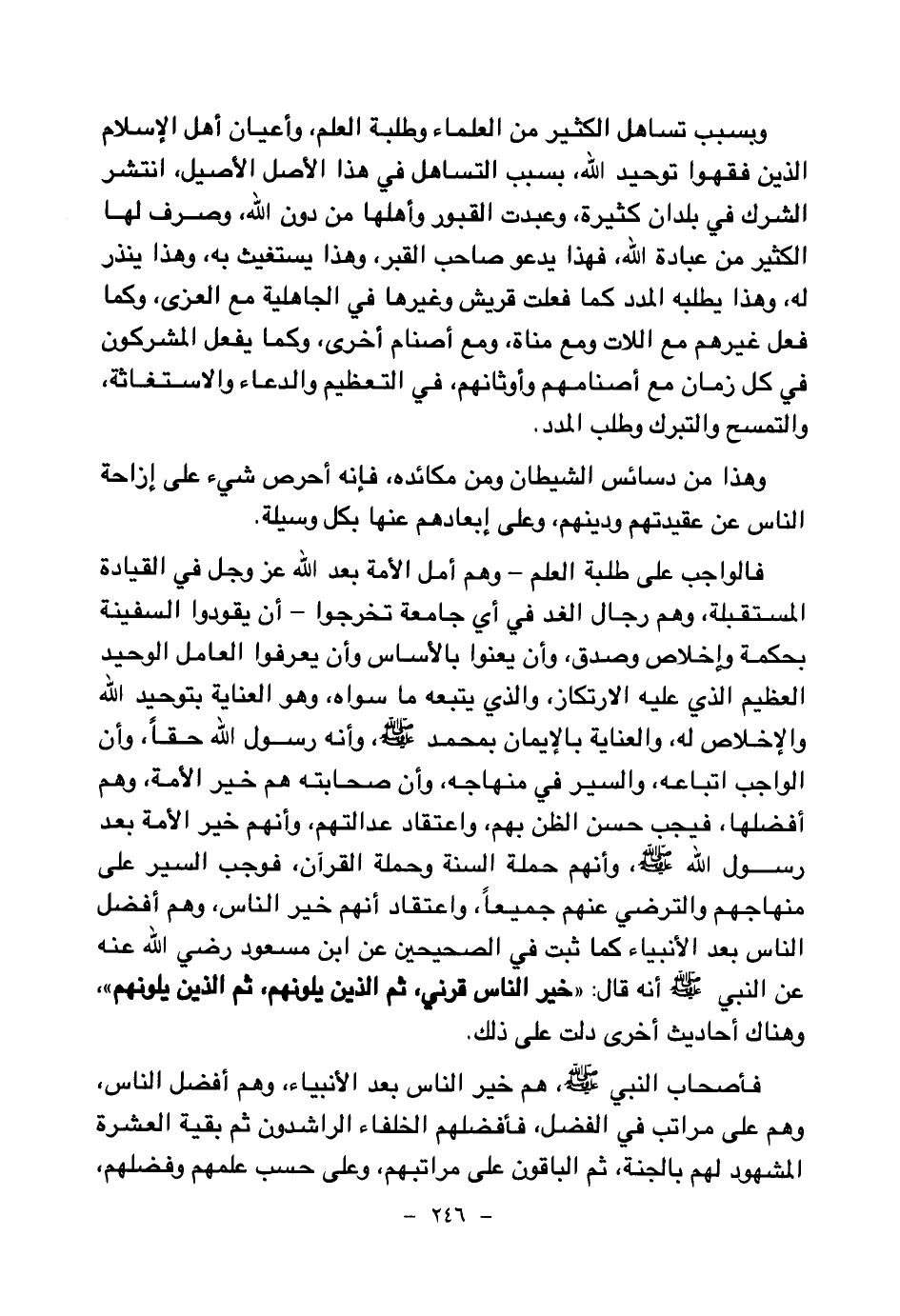 وبسبب تساهل الكثير من العلماء وطلبة العلم، وأعيان أهل الإسلام الذين فقهوا توحيد الله، بسبب التساهل في هذا الأصل الأصيل، انتشر الشرك في بلدان كثيرة، وعبدت القبور وأهلها من دون الله، وصرف لها الكثير من عبادة الله، فهذا يدعو صاحب القبر، وهذا يستغيث به، وهذا ينذر له، وهذا يطلبه المدد كما فعلت قريش وغيرها في الجاهلية مع العزى، وكما فعل غيرهم مع اللات ومع مناة، ومع أصنام أخرى، وكما يفعل المشركون في كل زمان مع أصنامهم وأوثانهم، في التعظيم والدعاء والاستغاثة، والتمسح والتبرك وطلب المدد.