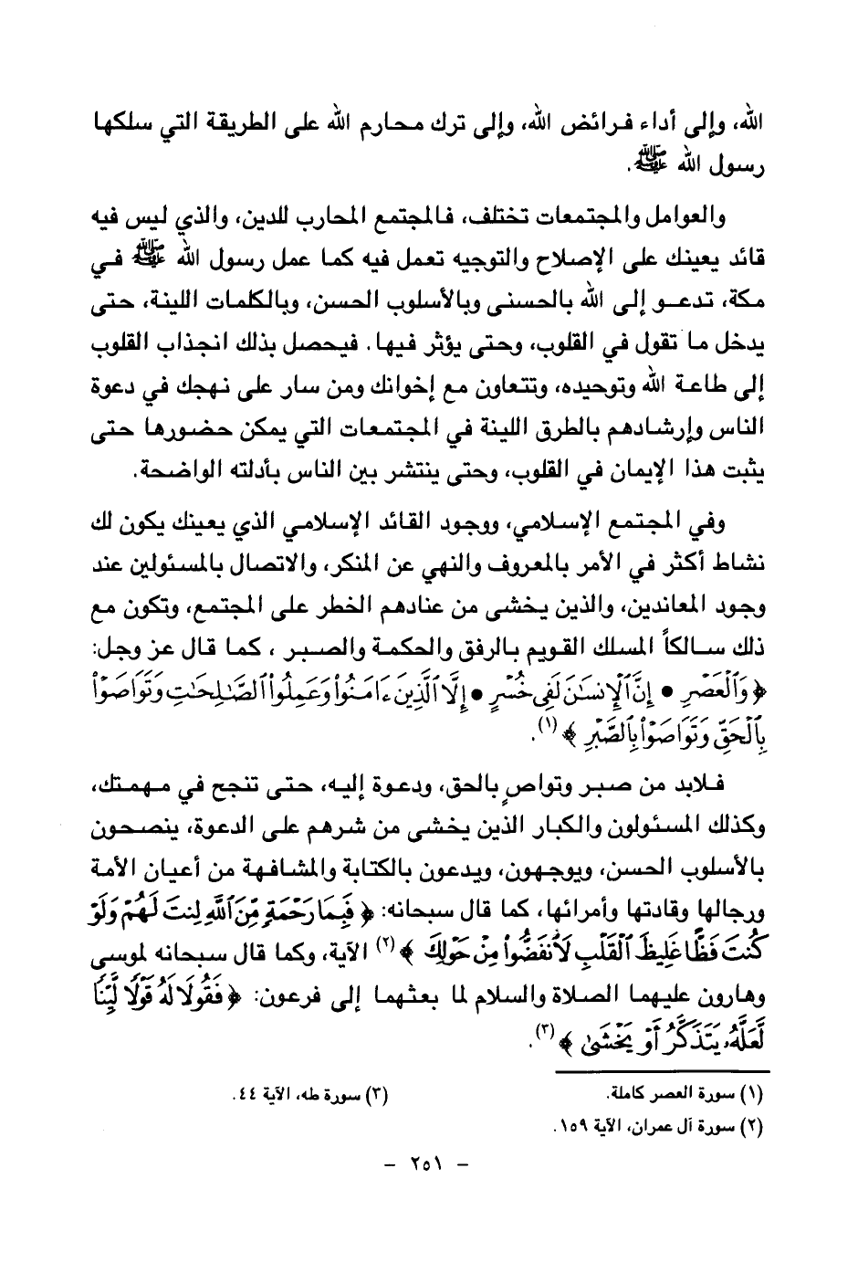 فلا بد من صبر وتواص بالحق، ودعوة إليه، حتى تنجح في مهمتك، وكذلك المسئولون والكبار الذين يخشى من شرهم على الدعوة، ينصحون بالأسلوب الحسن، ويوجهون، ويدعون بالكتابة والمشافهة من أعيان الأمة ورجالها وقادتها وأمرائها، كما قال سبحانه: {فَبِمَا رَحْمَةٍ مِنَ اللَّهِ لِنْتَ لَهُمْ وَلَوْ كُنْتَ فَظًّا غَلِيظَ الْقَلْبِ لَانْفَضُّوا مِنْ حَوْلِكَ} (¬4) الآية، وكما قال سبحانه لموسى وهارون عليهما الصلاة والسلام لما بعثهما إلى فرعون: {فَقُولَا لَهُ قَوْلًا لَيِّنًا لَعَلَّهُ يَتَذَكَّرُ أَوْ يَخْشَى} (¬5)