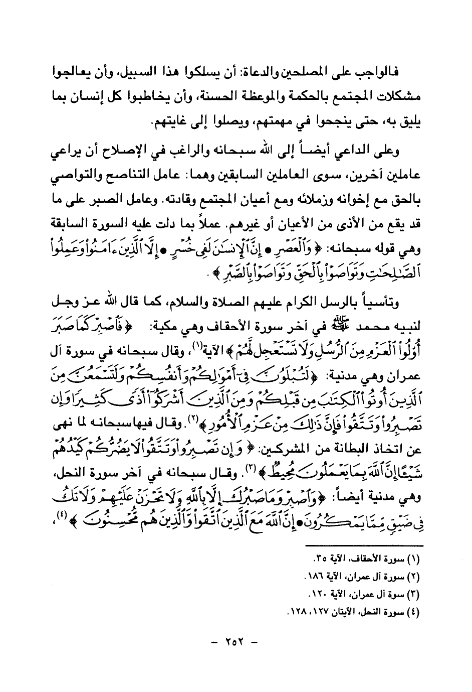وعلى الداعي أيضا إلى الله سبحانه والراغب في الإصلاح أن يراعي عاملين آخرين، سوى العاملين السابقين وهما: عامل التناصح والتواصي بالحق مع إخوانه وزملائه ومع أعيان المجتمع وقادته. وعامل الصبر على ما قد يقع من الأذى من الأعيان أو غيرهم. عملا بما دلت عليه السورة السابقة وهي قوله سبحانه: {وَالْعَصْرِ} (¬1) {إِنَّ الْإِنْسَانَ لَفِي خُسْرٍ} (¬2) {إِلَّا الَّذِينَ آمَنُوا وَعَمِلُوا الصَّالِحَاتِ وَتَوَاصَوْا بِالْحَقِّ وَتَوَاصَوْا بِالصَّبْرِ} (¬3)