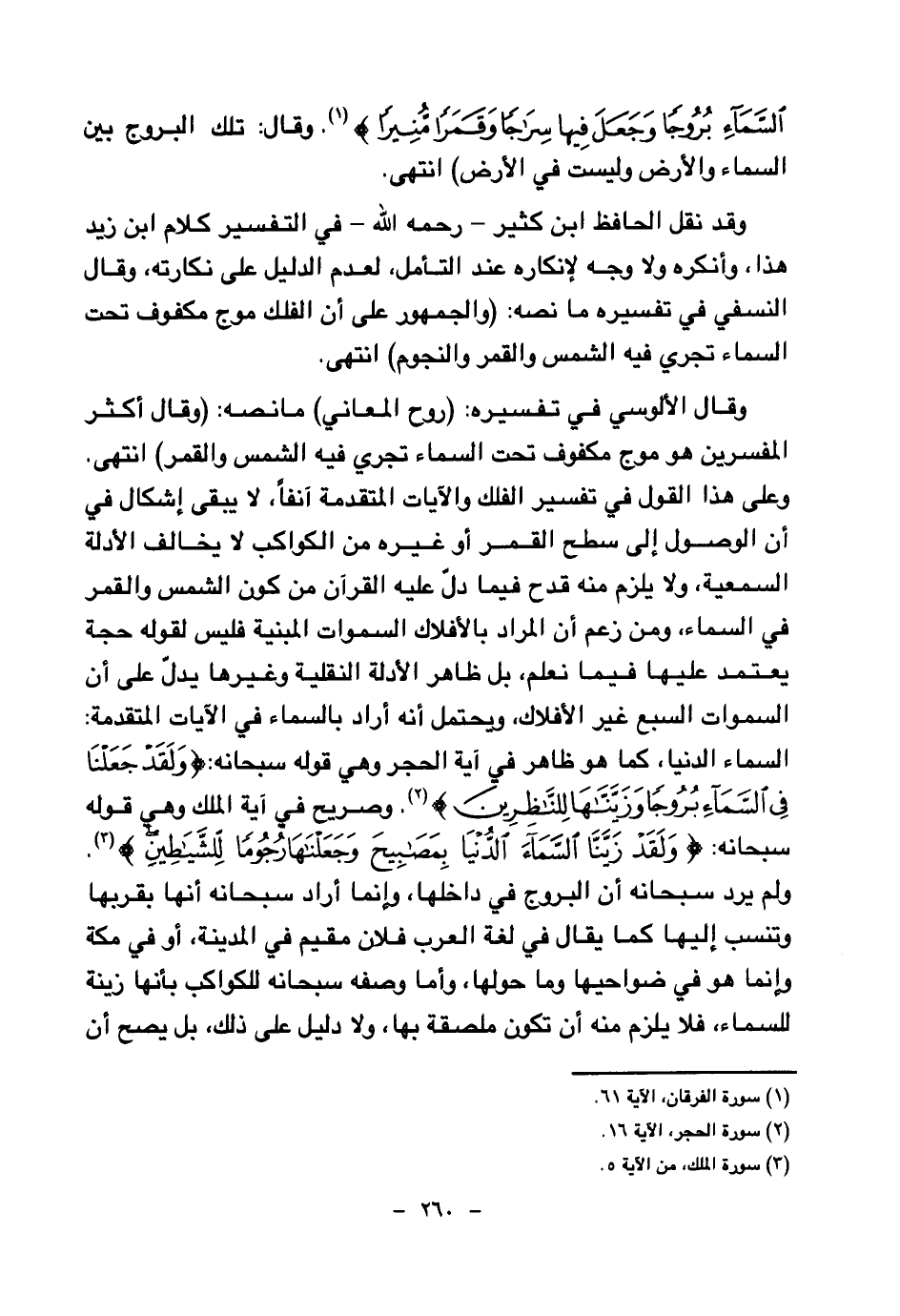 وعلى هذا القول في تفسير الفلك والآيات المتقدمة آنفا، لا يبقى إشكال في أن الوصول إلى سطح القمر أو غيره من الكواكب لا يخالف الأدلة السمعية، ولا يلزم منه قدح فيما دل عليه القرآن من كون الشمس والقمر في السماء، ومن زعم أن المراد بالأفلاك السماوات المبنية فليس لقوله حجة يعتمد عليها فيما نعلم، بل ظاهر الأدلة النقلية وغيرها يدل على أن السماوات السبع غير الأفلاك، ويحتمل أنه أراد بالسماء في الآيات المتقدمة: السماء الدنيا، كما هو ظاهر في آية الحجر وهي قوله سبحانه: {وَلَقَدْ جَعَلْنَا فِي السَّمَاءِ بُرُوجًا وَزَيَّنَّاهَا لِلنَّاظِرِينَ} (¬1) وصريح في آية الملك وهي قوله سبحانه: {وَلَقَدْ زَيَّنَّا السَّمَاءَ الدُّنْيَا بِمَصَابِيحَ وَجَعَلْنَاهَا رُجُومًا لِلشَّيَاطِينِ} (¬2) ولم يرد سبحانه أن البروج في داخلها، وإنما أراد سبحانه أنها بقربها وتنسب إليها كما يقال في لغة العرب فلان مقيم في المدينة، أو في مكة وإنما هو في ضواحيها وما حولها، وأما وصفه سبحانه للكواكب بأنها زينة للسماء فلا يلزم منه أن تكون ملصقة بها، ولا دليل على ذلك، بل يصح أن
