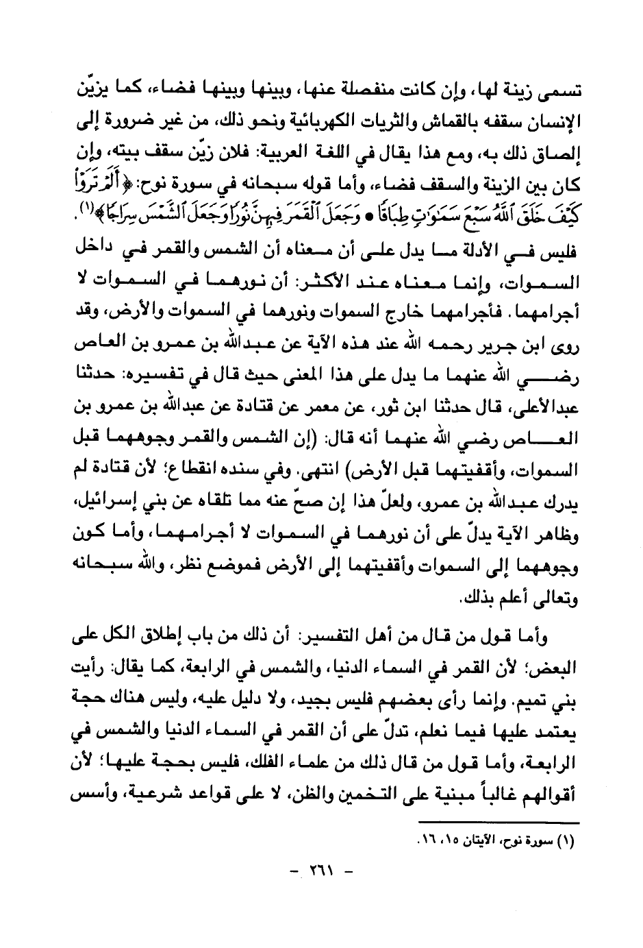 وأما قوله سبحانه في سورة نوح: {أَلَمْ تَرَوْا كَيْفَ خَلَقَ اللَّهُ سَبْعَ سَمَاوَاتٍ طِبَاقًا} (¬1) {وَجَعَلَ الْقَمَرَ فِيهِنَّ نُورًا وَجَعَلَ الشَّمْسَ سِرَاجًا} (¬2) فليس في الأدلة ما يدل على أن معناه أن الشمس والقمر في داخل السماوات، وإنما معناه عند الأكثر: أن نورهما في السماوات لا أجرامهما. فأجرامهما خارج السماوات ونورهما في السماوات والأرض،