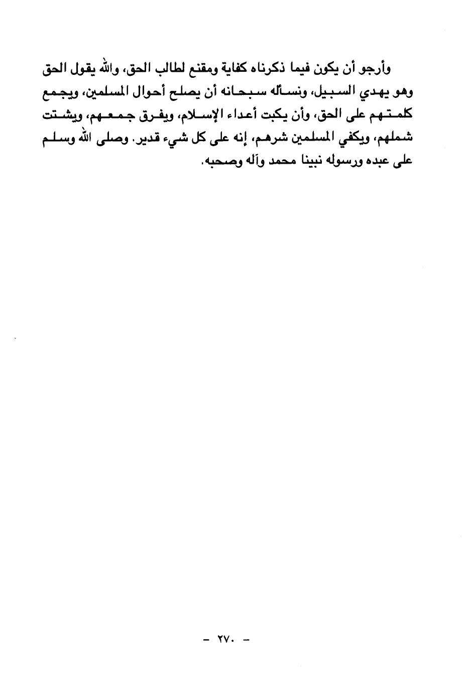 وأرجو أن يكون فيما ذكرناه كفاية ومقنع لطالب الحق، والله يقول الحق وهو يهدي السبيل، ونسأله سبحانه أن يصلح أحوال المسلمين، ويجمع كلمتهم على الحق، وأن يكبت أعداء الإسلام، ويفرق جمعهم، ويشتت شملهم، ويكفي المسلمين شرهم، إنه على كل شيء قدير.