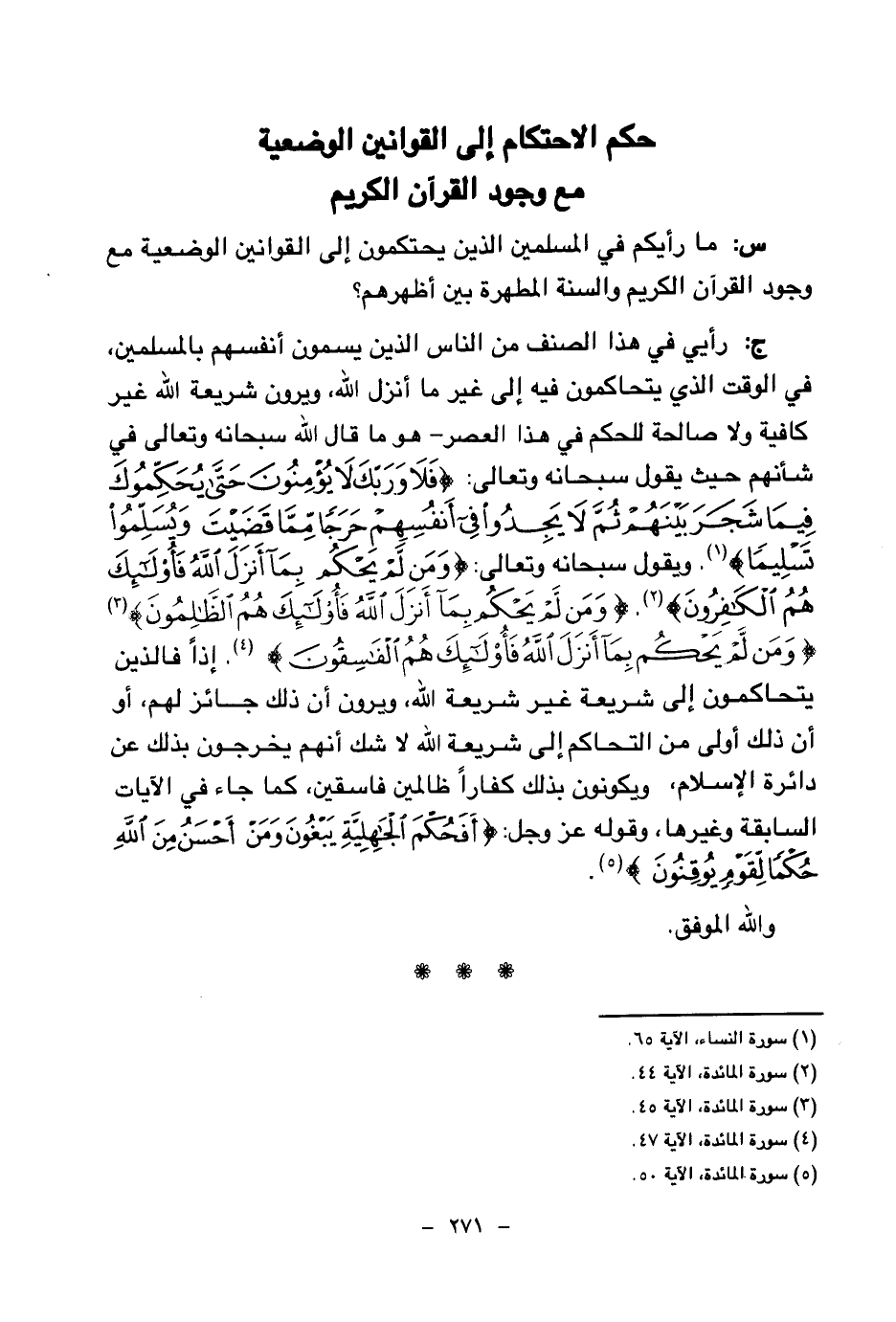 ج: رأيي في هذا الصنف من الناس الذين يسمون أنفسهم بالمسلمين، في الوقت الذي يتحاكمون فيه إلى غير ما أنزل الله، ويرون شريعة الله غير كافية ولا صالحة للحكم في هذا العصر - هو ما قال الله سبحانه وتعالى في شأنهم حيث يقول سبحانه وتعالى: {فَلَا وَرَبِّكَ لَا يُؤْمِنُونَ حَتَّى يُحَكِّمُوكَ فِيمَا شَجَرَ بَيْنَهُمْ ثُمَّ لَا يَجِدُوا فِي أَنْفُسِهِمْ حَرَجًا مِمَّا قَضَيْتَ وَيُسَلِّمُوا تَسْلِيمًا} (¬1) ويقول سبحانه وتعالى: {وَمَنْ لَمْ يَحْكُمْ بِمَا أَنْزَلَ اللَّهُ فَأُولَئِكَ هُمُ الْكَافِرُونَ} (¬2) {وَمَنْ لَمْ يَحْكُمْ بِمَا أَنْزَلَ اللَّهُ فَأُولَئِكَ هُمُ الظَّالِمُونَ} (¬3) {وَمَنْ لَمْ يَحْكُمْ بِمَا أَنْزَلَ اللَّهُ فَأُولَئِكَ هُمُ الْفَاسِقُونَ} (¬4)